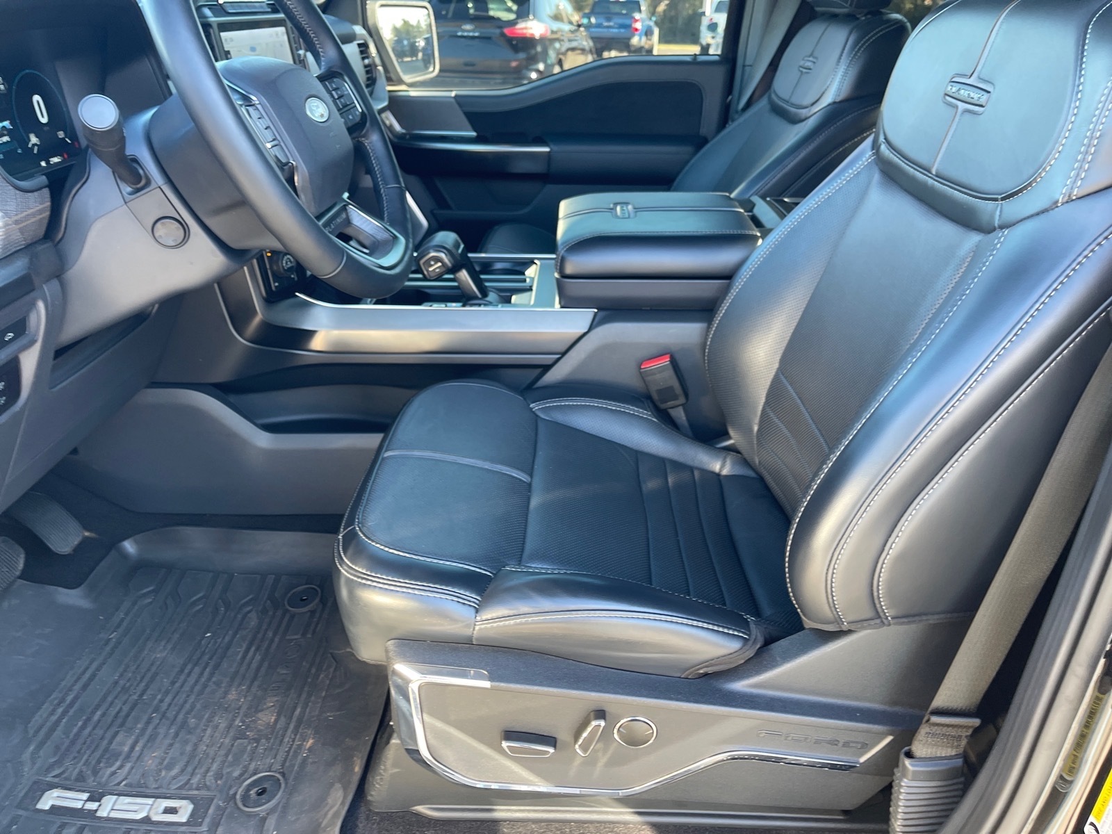 CARFAX One-Owner. Clean CARFAX. 2023 Ford F-150 Platinum 3.5L PowerBoost Full-Hybrid V6, 4WD, 20Polished Aluminum Wheels, 360 Degree Camera, 4-Wheel Disc Brakes, 4x4 FX4 Off-Road Bodyside Decal, 8 Speakers, ABS brakes, Active Park Assist 2.0, Active Park Assist 2.0 Removal, Adjustable pedals, Air Conditioning, Alloy wheels, AM/FM radio: SiriusXM with 360L, Auto High-beam Headlights, Auto Start-Stop Removal (DISC), Auto tilt-away steering wheel, Auto-dimming door mirrors, Auto-dimming Rear-View mirror, Automatic temperature control, Bed Utility Package, BoxLink, Brake assist, Bumpers: body-color, Center High-Mounted Stop Lamp CHMSL Camera Removal, Class IV Trailer Hitch Receiver, Compass, Delay-off headlights, Driver door bin, Driver vanity mirror, Dual front impact airbags, Dual front side impact airbags, Electronic Stability Control, Emergency communication system: SYNC 4 911 Assist, Equipment Group 701A High, Extended Range 36 Gallon Fuel Tank, Exterior Parking Camera Rear, Ford BlueCruise 1.0, Front anti-roll bar, Front Bucket Seats, Front Center Armrest, Front dual zone A/C, Front fog lights, Front reading lights, Front wheel independent suspension, Fully automatic headlights, FX4 Off-Road Package, Garage door transmitter, Heated door mirrors, Heated front seats, Heated rear seats, Heated steering wheel, Hill Descent Control, Illuminated entry, Inclination/Intrusion Sensor Removal, Integrated Trailer Brake Controller, Interior Work Surface, LED Box Lighting, LED Sideview Mirror Spotlights, Low tire pressure warning, Max Trailer Tow Package, Memory seat, Monotube Rear Shocks, Multicontour Seats w/Active Motion Removal, Occupant sensing airbag, Off-Road Tuned Front Shock Absorbers, Outside temperature display, Overhead airbag, Overhead console, Panic alarm, Passenger door bin, Passenger vanity mirror, Pedal memory, Power door mirrors, Power driver seat, Power passenger seat, Power steering, Power Tailgate, Power windows, Pro Power Onboard - 7.2KW, Pro Trailer Backup Assist & Pro Trailer Hitch Assist, Radio data system, Radio: B&O Sound System by Bang & Olufsen, Radio: B&O Unleashed Sound System by Bang & Olufsen, Rain sensing wipers, Rear reading lights, Rear seat center armrest, Rear step bumper, Rear window defroster, Remote keyless entry, Rock Crawl Mode, Security system, Speed control, Speed-sensing steering, Split folding rear seat, Steering Wheel Heat Removal (DISC), Steering wheel memory, Steering wheel mounted audio controls, SYNC 4 w/Enhanced
