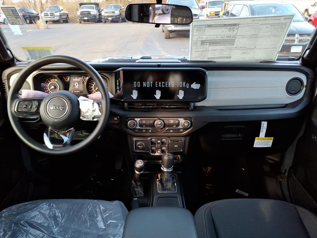 Anvil Clear Coat 2026 Jeep Wrangler Sport 4WD 8-Speed Automatic 3.6L V6 24V VVT 3.45 Overall Top Gear Ratio, 4-Wheel Disc Brakes, 8 Speakers, ABS brakes, Air Conditioning, AM/FM radio: SiriusXM with 360L, Apple CarPlay/Android Auto, Aux Battery, Black 3-Piece Hard Top, Brake assist, Cloth Low-Back Bucket Seats, Compass, Delay-off headlights, Driver door bin, Driver vanity mirror, Dual front impact airbags, Dual front side impact airbags, Electronic Stability Control, Freedom Panel Storage Bag, Front anti-roll bar, Front Bucket Seats, Front Center Armrest w/Storage, Front fog lights, Front reading lights, Illuminated entry, Integrated roll-over protection, Low tire pressure warning, MOPAR All-Weather Floor Mats, Normal Duty Suspension, Occupant sensing airbag, Outside temperature display, Overhead airbag, Panic alarm, ParkView Rear Back-Up Camera, Passenger door bin, Passenger vanity mirror, Power steering, Power windows, Quick Order Package 24B Sport, Radio data system, Rear anti-roll bar, Rear reading lights, Rear Window Defroster, Rear Window Wiper/Washer, Remote keyless entry, Speed control, Split folding rear seat, Steering wheel mounted audio controls, Stop-Start Dual Battery System, Tachometer, Telescoping steering wheel, Tilt steering wheel, Traction control, Trip computer, Variably intermittent wipers, Wheels: 17x 7.5Black Steel Styled.