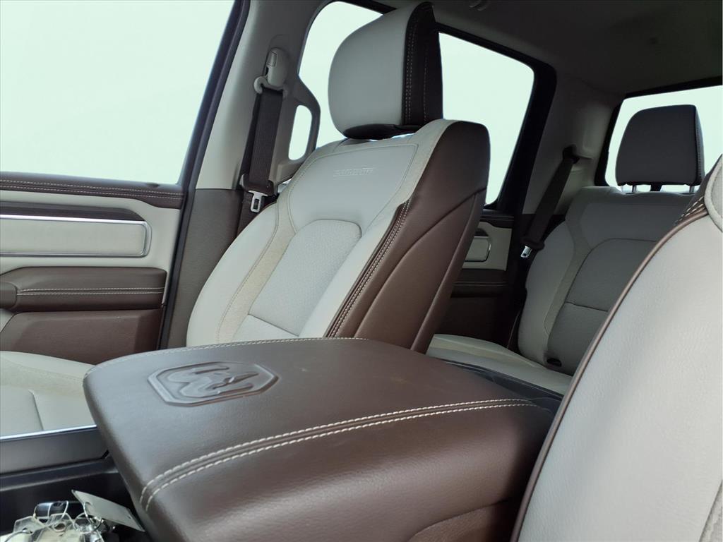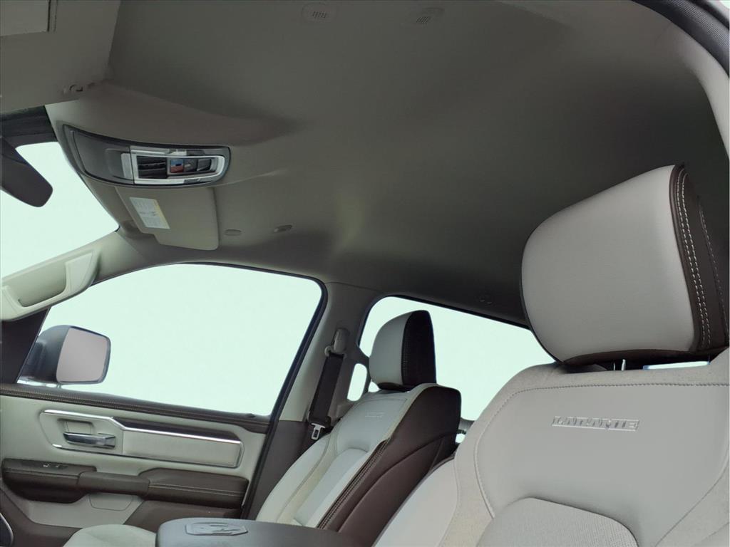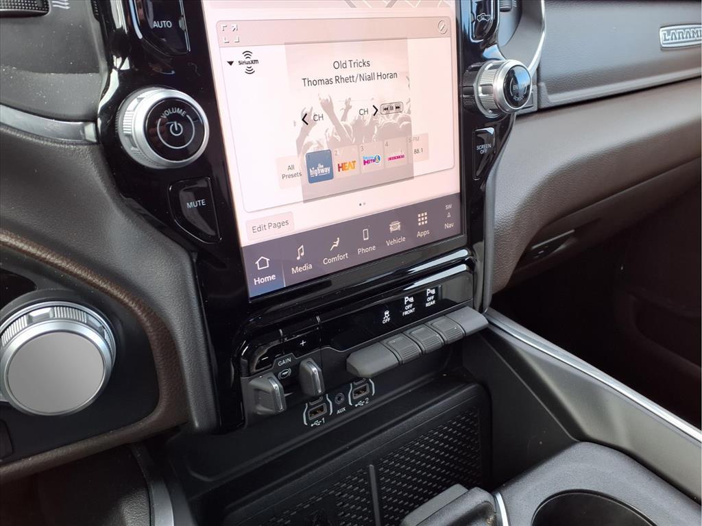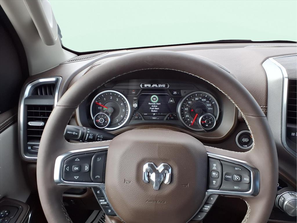10 Speakers, 3 Rear Seat Head Restraints, 3.55 Rear Axle Ratio, 4 Way Front Headrests, 4-Wheel Disc Brakes, 4G LTE Wi-Fi Hot Spot, ABS brakes, Air Conditioning, Alloy wheels, AM/FM radio: SiriusXM with 360L, Anti-Spin Differential Rear Axle, Apple CarPlay, Apple CarPlay/Android Auto, Audio memory, Auto High-beam Headlights, Auto Power-Folding Mirrors, Auto-dimming door mirrors, Auto-Dimming Exterior Driver Mirror, Auto-dimming Rear-View mirror, Automatic temperature control, Brake assist, Bumpers: chrome, Chrome Exterior Mirrors, Compass, Connected Travel & Traffic Services, Connectivity - US/Canada, Convex Wide-Angle Exterior Mirror Insert, Delay-off headlights, Driver door bin, Driver Seat Memory, Driver vanity mirror, Dual front impact airbags, Dual front side impact airbags, Electronic Stability Control, Exterior Mirrors Courtesy Lamps, Exterior Mirrors w/Heating Element, Exterior Mirrors w/Memory, Exterior Mirrors w/Supplemental Signals, Front anti-roll bar, Front Center Armrest w/Storage, Front dual zone A/C, Front fog lights, Front License Plate Bracket, Front reading lights, Front Seat Back Map Pockets, Front wheel independent suspension, Fully automatic headlights, Garage door transmitter, Google Android Auto, GPS Antenna Input, GPS Navigation, HD Radio, Heated door mirrors, Heated Front Seats, Heated front seats, Heated rear seats, Heated Steering Wheel, Heated steering wheel, Illuminated entry, Integrated Voice Command w/Bluetooth, Laramie Level 1 Equipment Group, Leather steering wheel, Leather Trim 40/20/40 Bench Seat, Low tire pressure warning, Memory seat, Navigation System, Occupant sensing airbag, Outside temperature display, Overhead airbag, Overhead console, Panic alarm, ParkView Rear Back-Up Camera, Passenger door bin, Passenger vanity mirror, Power 2-Way Driver Lumbar Adjust, Power 2-Way Passenger Lumbar Adjust, Power Adjust 8-Way Front Passenger Seat, Power door mirrors, Power driver seat, Power passenger seat, Power steering, Power windows, Quick Order Package 21H Laramie, Radio data system, Radio: Uconnect 5 Nav w/12.0Display, Rain Sensitive Windshield Wipers, RAM Grille Badge - Chrome, Rear anti-roll bar, Rear reading lights, Rear seat center armrest, Rear step bumper, Remote keyless entry, Remote Tailgate Release, Security system, SiriusXM w/360L, Speed control, Split folding rear seat, Steering wheel mounted audio controls, Tachometer, Telescoping steering wheel, Tilt steering wheel, Traction control, Trailer Brake Control, Tri
