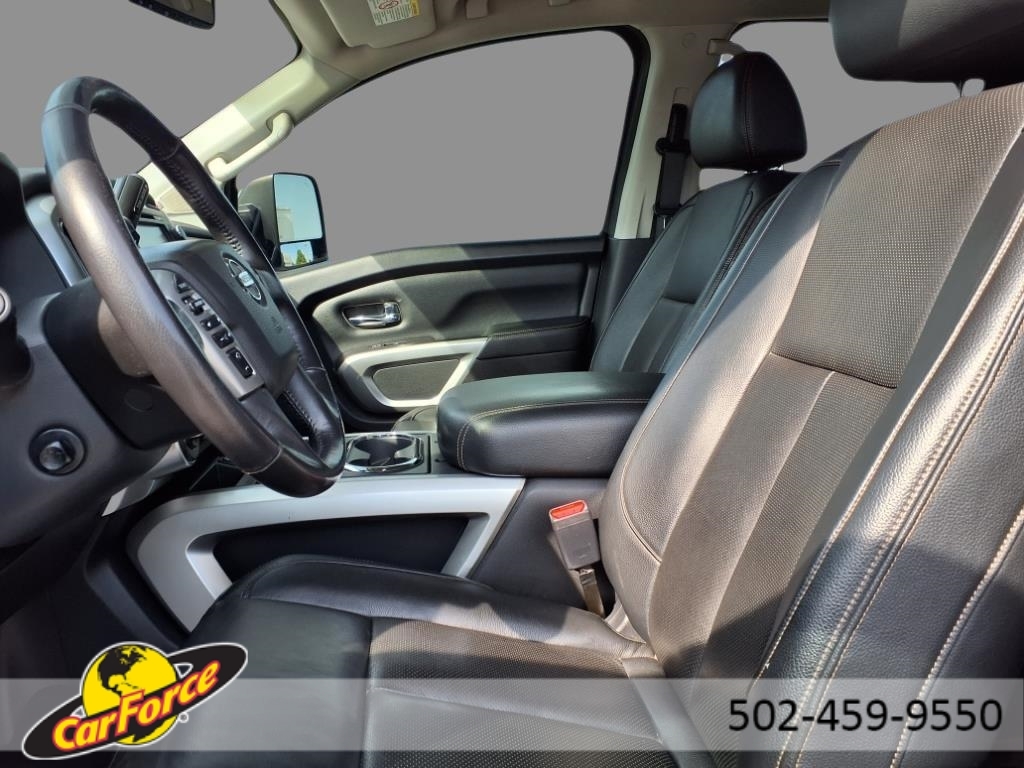 Dual front airbags, front seat mounted side-impact airbags, dual front/rear head curtain airbags with rollover sensor, four-wheel disc brakes with anti-lock, brake assist, electronic brake force distribution, traction control, vehicle dynamic control, high-strength steel side door guard beams, vehicle security system, engine immobilizer, Bluetooth hands free phone system, NissanConnect, remote keyless entry, full-size spare tire, and tire pressure monitoring system. SV adds trailer sway control. PRO-4X adds automatic headlights, daytime running lights, fog lights, navigation system, rain-sensing windshield wipers, RearView Monitor, blind spot warning, and rear cross traffic alert. SL adds remote engine start, HomeLink universal transceiver, and front/rear sonar systems. Platinum Reserve adds trailer brake controller, and Around View Monitor.