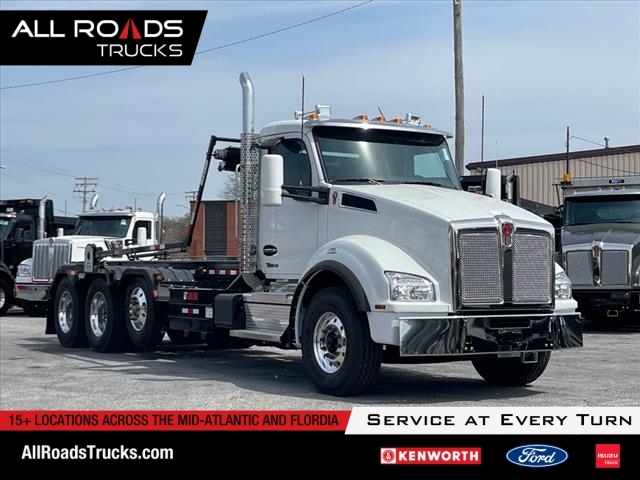 2025 Kenworth T880 with Galfab 60k Outside Rail Roll-off Hoist Exterior Color: White (L0006EY) Wheelbase: 268 inches Frame: 10-3/4 x 3/8 inch steel section with full steel inserts / double frame Cab to axle: 194 inches Engine & Transmission Engine: Cummins X15 Performance Series, 525 HP @ 1900 RPM, 1850 lb-ft torque @ 1000 RPM Engine Brake: Jacobs compression brake Transmission: Allison 4500RDS 6-speed automatic with PTO provision Chassis Specifications Front Axle: Dana Spicer D2000 20,000 lb capacity Rear Axle: Dana Spicer D46-172HP 46,000 lb tandem Pusher Axle: Watson & Chalin SL2065 13,500 lb capacity Front Suspension: Taperleaf 20,000 lb capacity with shocks Rear Suspension: Hendrickson HAULMAAX EX 46,000 lb capacity Rear Axle Ratio: 4.30 Wheel Differential Lock: D40-170/172(H), (P)(WT) RR RR GVWR: 79,200 lbs Brakes Front/Rear: Drum brakes (16.5x6 front, 16.5x7 rear) ABS: Bendix 4S/4M Fuel & DEF Tanks Fuel Tank: 100 US gallon aluminum DEF Tank: 14 gallon Wheels & Tires Front Wheels: Alcoa 89U63 22.5x9 Ultra One high polish aluminum Rear Wheels: Alcoa 98U63 24.5x8.25 Ultra One high polish aluminum Front Tires: Michelin AP Endurax MA 315/80R22.5 20PR Rear Tires: Goodyear Endurance LHD 11R24.5 14PR Cab & Interior Interior: Vantage trim level in Slate Gray Driver Seat: Kenworth GT701 high back air suspension with Duracloth and vinyl trim Passenger Seat: Kenworth GT100 high back toolbox seat Steering Wheel: 18-inch non-leather with integrated radio and cruise controls Additional Features Kenworth TruckTech remote diagnostics 15 digital display main instrument package Air conditioning with auto temperature control Kenworth Radio DEA710 AM/FM/WB/USB, Bluetooth Dual rectangular 23 air horns roof-mounted Stainless steel sun visor Dual Kenworth Aero heated mirrors Galfab 60k Outside Rail Roll-off Hoist 5-spool hoist system Pump: Permco, 1 PTO-driven hydraulic system Oil tank included