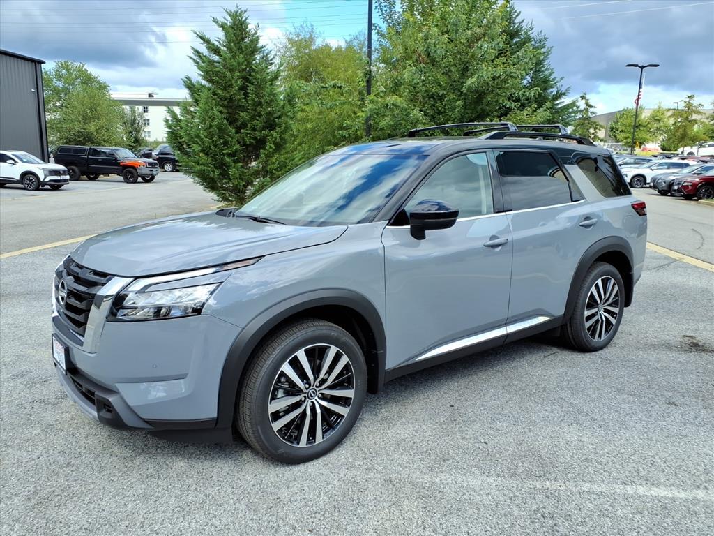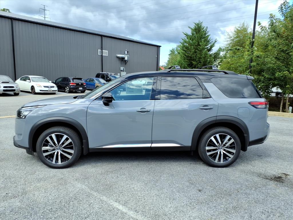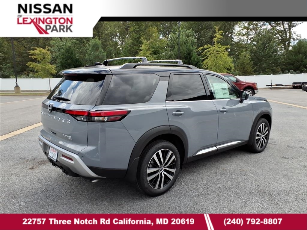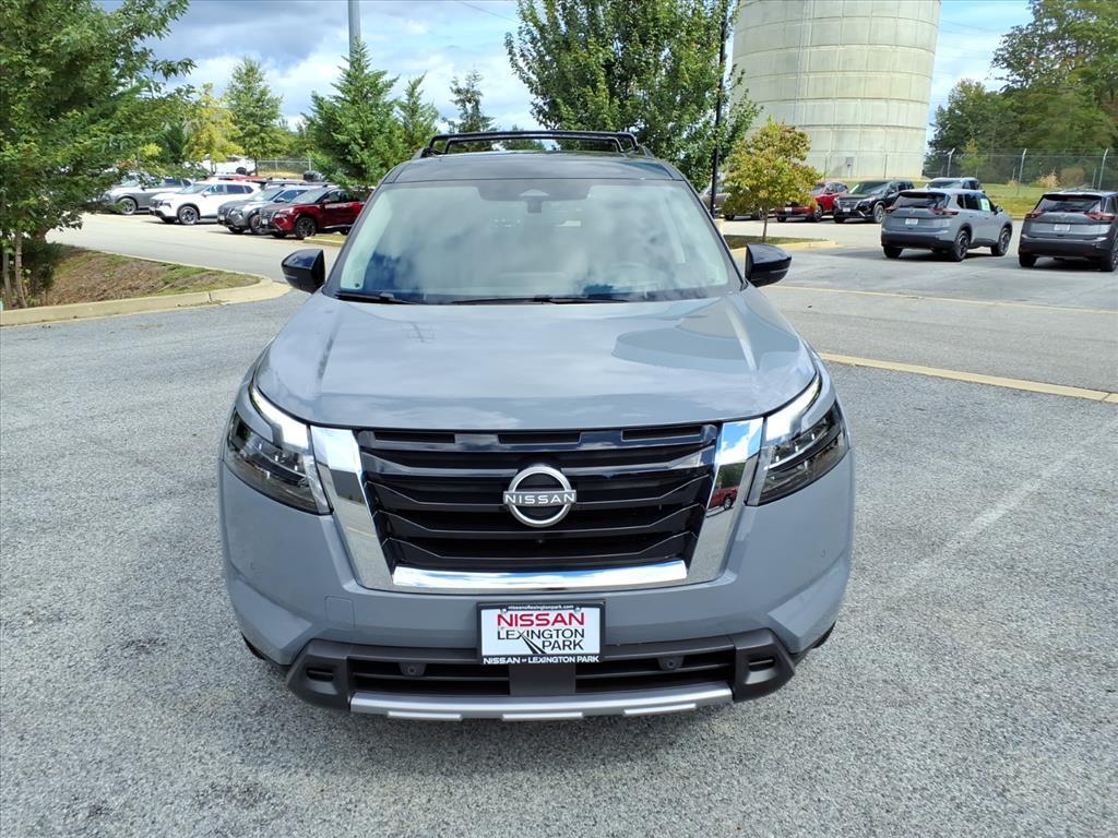 Solid Gray/Super Black 2025 Nissan Pathfinder Platinum 13 Speakers, 3rd row seats: bench, 4-Wheel Disc Brakes, ABS brakes, Air Conditioning, Alloy wheels, AM/FM radio: SiriusXM, Auto High-beam Headlights, Auto tilt-away steering wheel, Auto-dimming Rear-View mirror, Automatic temperature control, Bodyside moldings, Bose Premium Audio System, Brake assist, Bumpers: body-color, Climate Controlled Front Bucket Seats, Delay-off headlights, Driver door bin, Driver vanity mirror, Dual front impact airbags, Dual front side impact airbags, Electronic Stability Control, Emergency communication system, Exterior Parking Camera Rear, Four wheel independent suspension, Front anti-roll bar, Front Bucket Seats, Front Center Armrest, Front dual zone A/C, Front reading lights, Fully automatic headlights, Garage door transmitter: HomeLink, Heads-Up Display, Heated door mirrors, Heated front seats, Heated rear seats, Heated steering wheel, Illuminated entry, Knee airbag, Leather steering wheel, Low tire pressure warning, Memory seat, Navigation system: NissanConnect with Navigation and Services, NissanConnect featuring Apple CarPlay and Android Auto, NissanConnect with Navigation and Services, Occupant sensing airbag, Outside temperature display, Overhead airbag, Overhead console, Panic alarm, Passenger door bin, Passenger vanity mirror, Power door mirrors, Power driver seat, Power Liftgate, Power moonroof, Power passenger seat, Power steering, Power windows, Radio data system, Radio: AM/FM Audio System, Rain sensing wipers, Rear air conditioning, Rear anti-roll bar, Rear reading lights, Rear seat center armrest, Rear side impact airbag, Rear window defroster, Rear window wiper, Reclining 3rd row seat, Remote keyless entry, Security system, Semi-Aniline Leather-Appointed Seating Surfaces, Speed control, Speed-sensing steering, Speed-Sensitive Wipers, Split folding rear seat, Spoiler, Steering wheel memory, Steering wheel mounted audio controls, Tachometer, Telescoping steering wheel, Tilt steering wheel, Traction control, Trip computer, Turn signal indicator mirrors, Variably intermittent wipers, Ventilated front seats, Wheels: 20x 8J Machined Alloy. Price includes: $5000 - Nissan Customer Cash. Exp. 01/05/2026