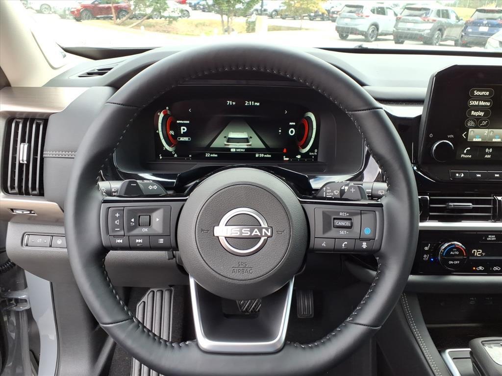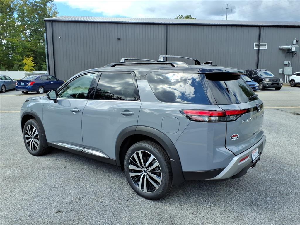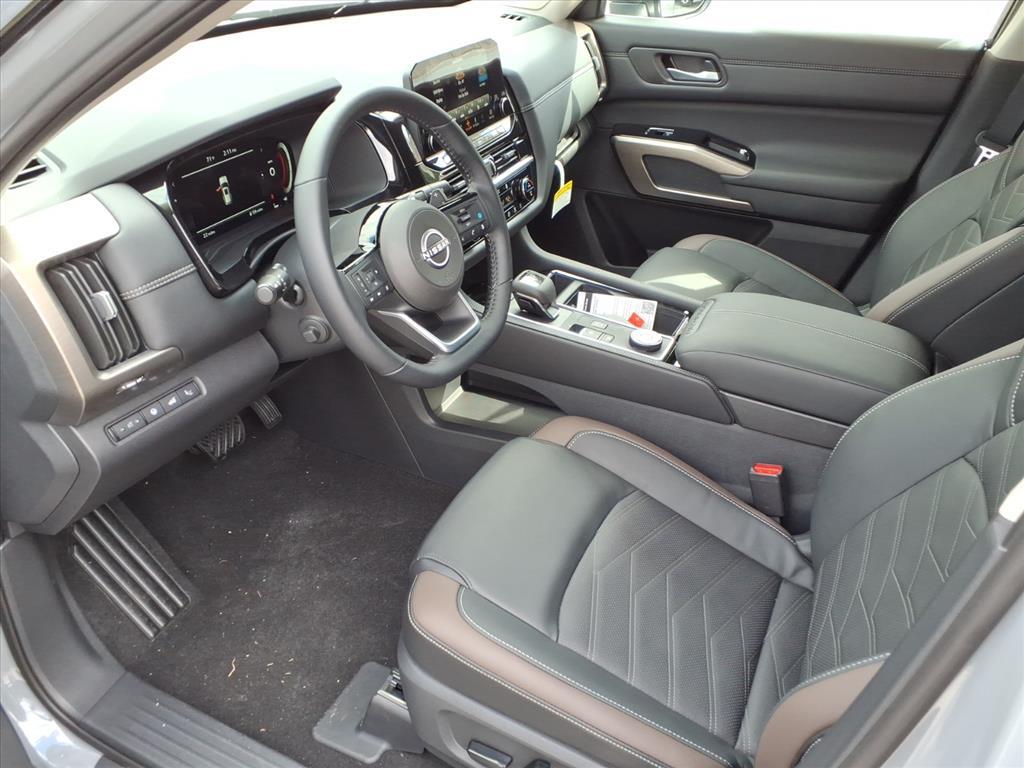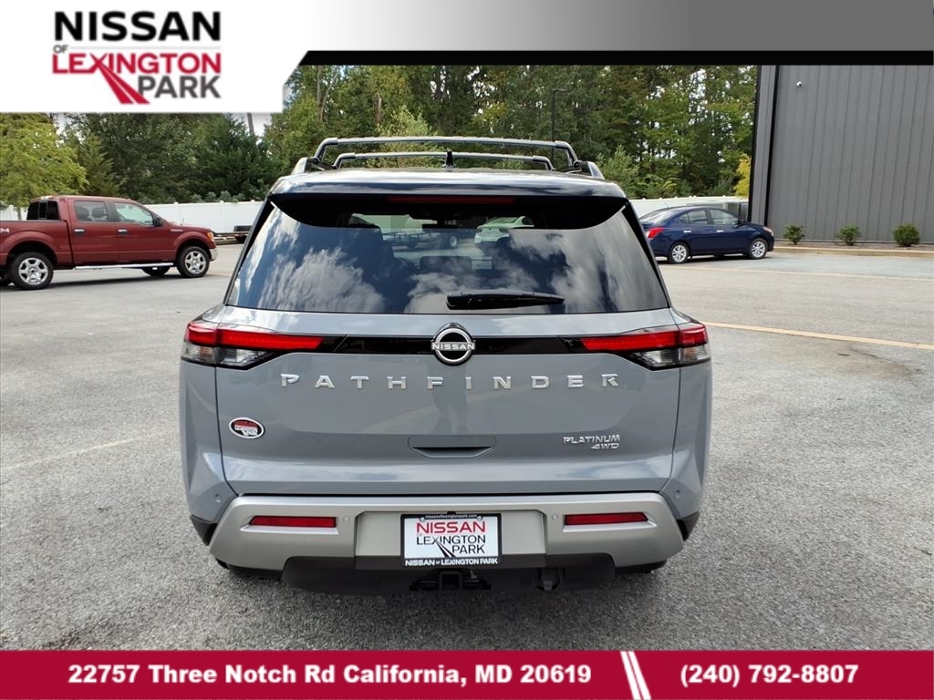 Solid Gray/Super Black 2025 Nissan Pathfinder Platinum 13 Speakers, 3rd row seats: bench, 4-Wheel Disc Brakes, ABS brakes, Air Conditioning, Alloy wheels, AM/FM radio: SiriusXM, Auto High-beam Headlights, Auto tilt-away steering wheel, Auto-dimming Rear-View mirror, Automatic temperature control, Bodyside moldings, Bose Premium Audio System, Brake assist, Bumpers: body-color, Climate Controlled Front Bucket Seats, Delay-off headlights, Driver door bin, Driver vanity mirror, Dual front impact airbags, Dual front side impact airbags, Electronic Stability Control, Emergency communication system, Exterior Parking Camera Rear, Four wheel independent suspension, Front anti-roll bar, Front Bucket Seats, Front Center Armrest, Front dual zone A/C, Front reading lights, Fully automatic headlights, Garage door transmitter: HomeLink, Heads-Up Display, Heated door mirrors, Heated front seats, Heated rear seats, Heated steering wheel, Illuminated entry, Knee airbag, Leather steering wheel, Low tire pressure warning, Memory seat, Navigation system: NissanConnect with Navigation and Services, NissanConnect featuring Apple CarPlay and Android Auto, NissanConnect with Navigation and Services, Occupant sensing airbag, Outside temperature display, Overhead airbag, Overhead console, Panic alarm, Passenger door bin, Passenger vanity mirror, Power door mirrors, Power driver seat, Power Liftgate, Power moonroof, Power passenger seat, Power steering, Power windows, Radio data system, Radio: AM/FM Audio System, Rain sensing wipers, Rear air conditioning, Rear anti-roll bar, Rear reading lights, Rear seat center armrest, Rear side impact airbag, Rear window defroster, Rear window wiper, Reclining 3rd row seat, Remote keyless entry, Security system, Semi-Aniline Leather-Appointed Seating Surfaces, Speed control, Speed-sensing steering, Speed-Sensitive Wipers, Split folding rear seat, Spoiler, Steering wheel memory, Steering wheel mounted audio controls, Tachometer, Telescoping steering wheel, Tilt steering wheel, Traction control, Trip computer, Turn signal indicator mirrors, Variably intermittent wipers, Ventilated front seats, Wheels: 20x 8J Machined Alloy. Price includes: $5000 - Nissan Customer Cash. Exp. 01/05/2026