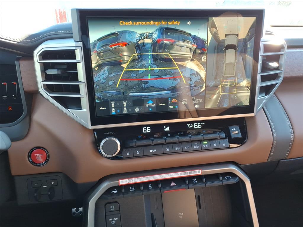 Dual front airbags, dual front seat side-impact airbags, dual front seat knee airbags, dual roll-sensing side curtain airbags, four-wheel disc brakes with anti-lock, brake assist, electronic brake force distribution, smart stop technology, traction control, vehicle stability control, automatic limited slip differential, pre-collision system with pedestrian protection, lane departure alert, sway warning system, automatic high beams, dynamic radar cruise control, daytime running lights, automatic power door locks, remote keyless entry, trailer sway control, anti theft system, engine immobilizer, and tire pressure monitoring system. SR5 Double Cab adds fog lights. TRD Double Cab adds navigation system. Limited Double Cab adds Bluetooth hands-free phone system and integrated trailer brake controller. Platinum CrewMax adds front and rear parking assist sonar system, blind spot monitor, and rear cross traffic alert.