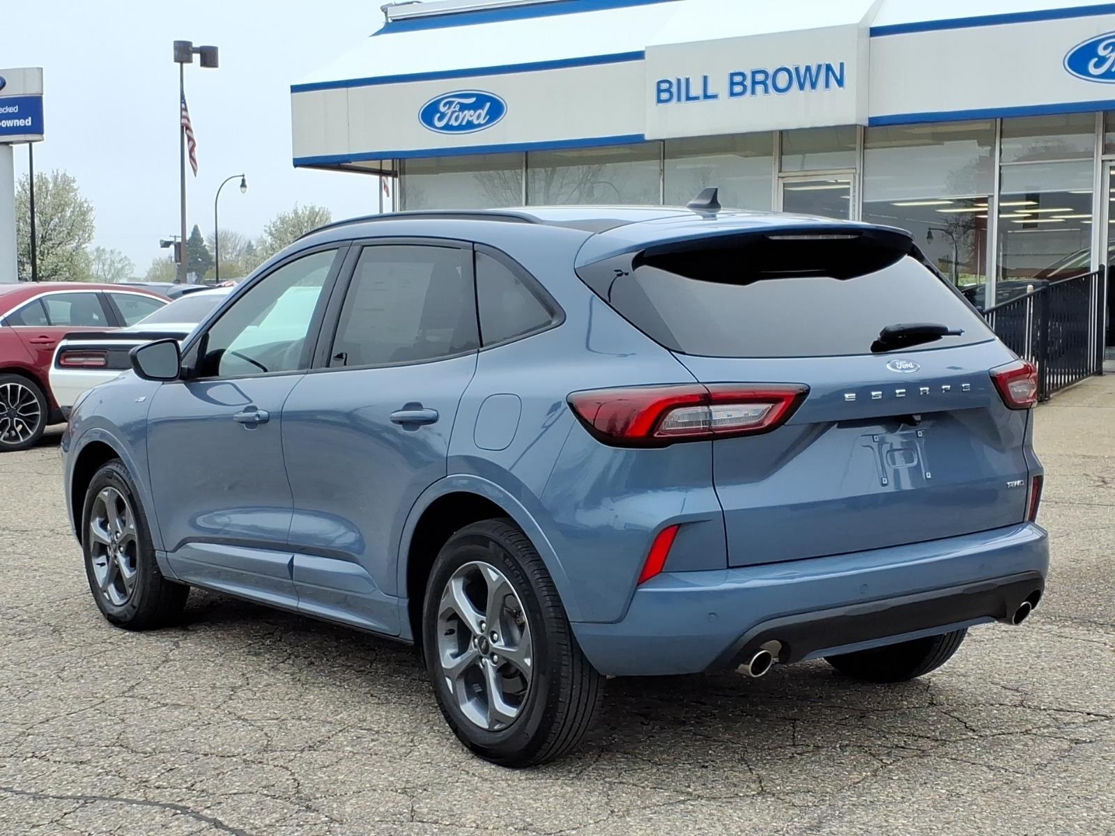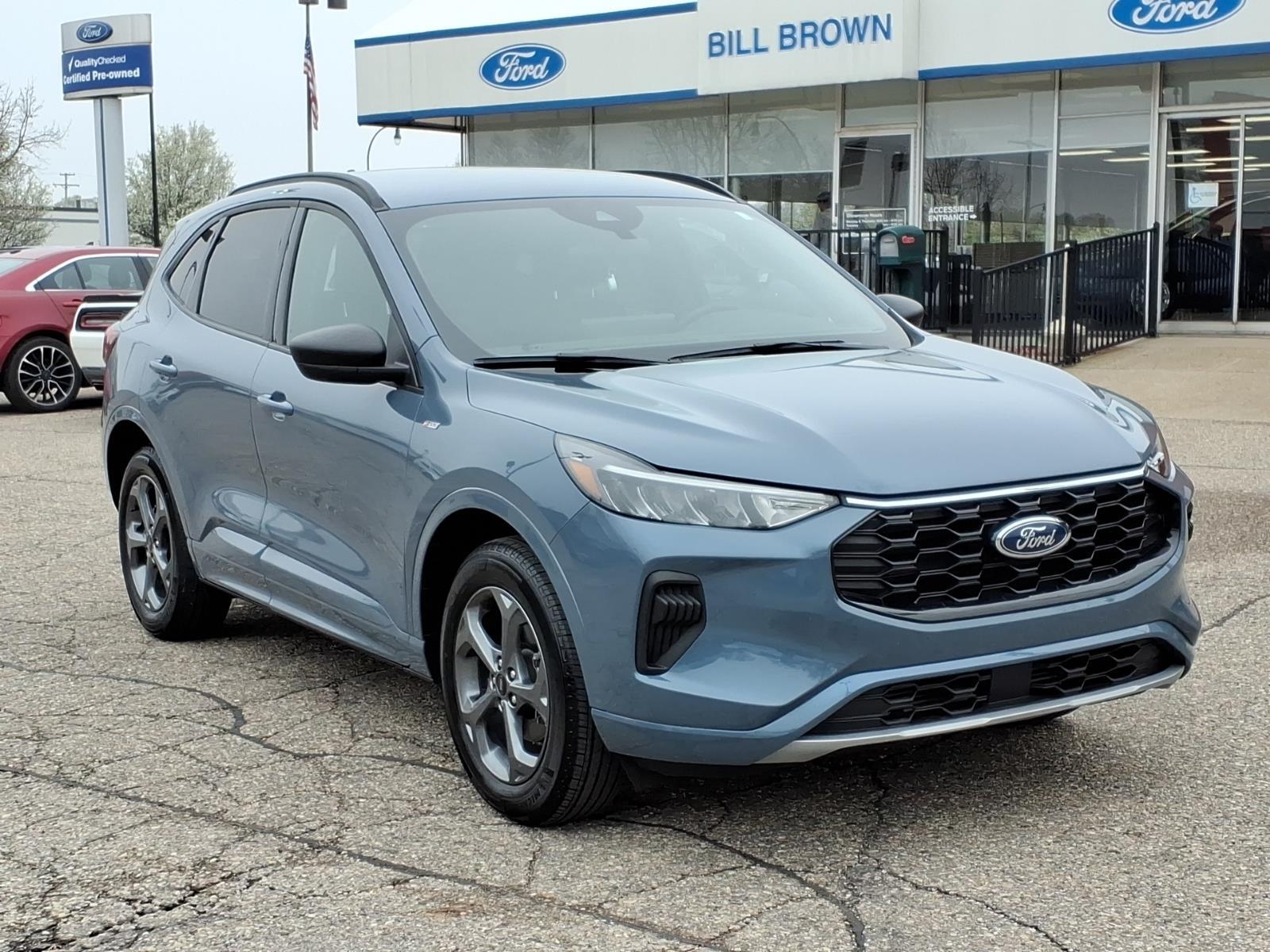 The Ford Escape ST-Line is a vehicle of the future, made in 2024. It has low mileage, with only 10,856 miles, and is certified pre-owned. This car is equipped with an all wheel drive, 1.5 liter EcoBoost Turbo I3 180hp 199 lb-ft engine, and direct injection. It has a vapor blue exterior and ebony w/red stitching interior. The fuel economy in city is 26 mpg and fuel economy on highway is 32 mpg. It also has a crash test rating of 5 out of 5 stars. The car comes with many features such as touch screen display, Bluetooth audio connection, blind spot sensor, hill start assist, on demand four wheel drive, and Bluetooth phone connectivity. This car is sure to turn heads on the road! Call Bill Brown Ford Pre-owned at (734) 522-0030 to confirm availability and schedule a no-obligation test drive!