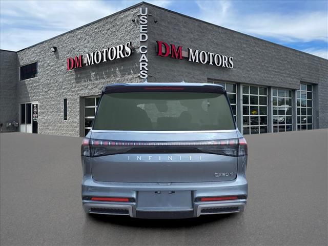 The QX80 rides on a high-stiffness frame structure that enhances ride comfort while reducing noise, vibration and harshness. The control hardware features an independent double-wishbone design front and rear, with Dual-Flow Path® twin tube shock absorbers and an automatic rear leveling system that seeks to maintain uniform ground clearance and departure angle, even when towing or carrying cargo, by automatically adjusting the air pressure in the system's air bladders.