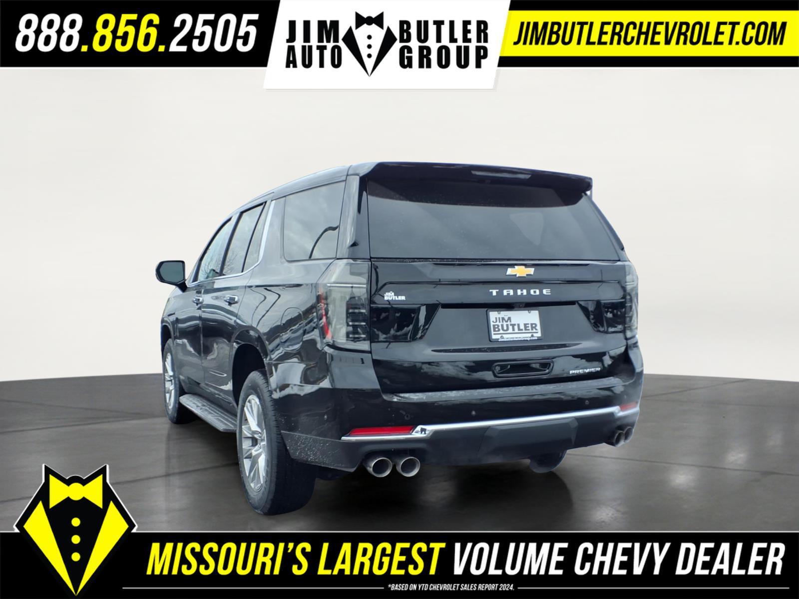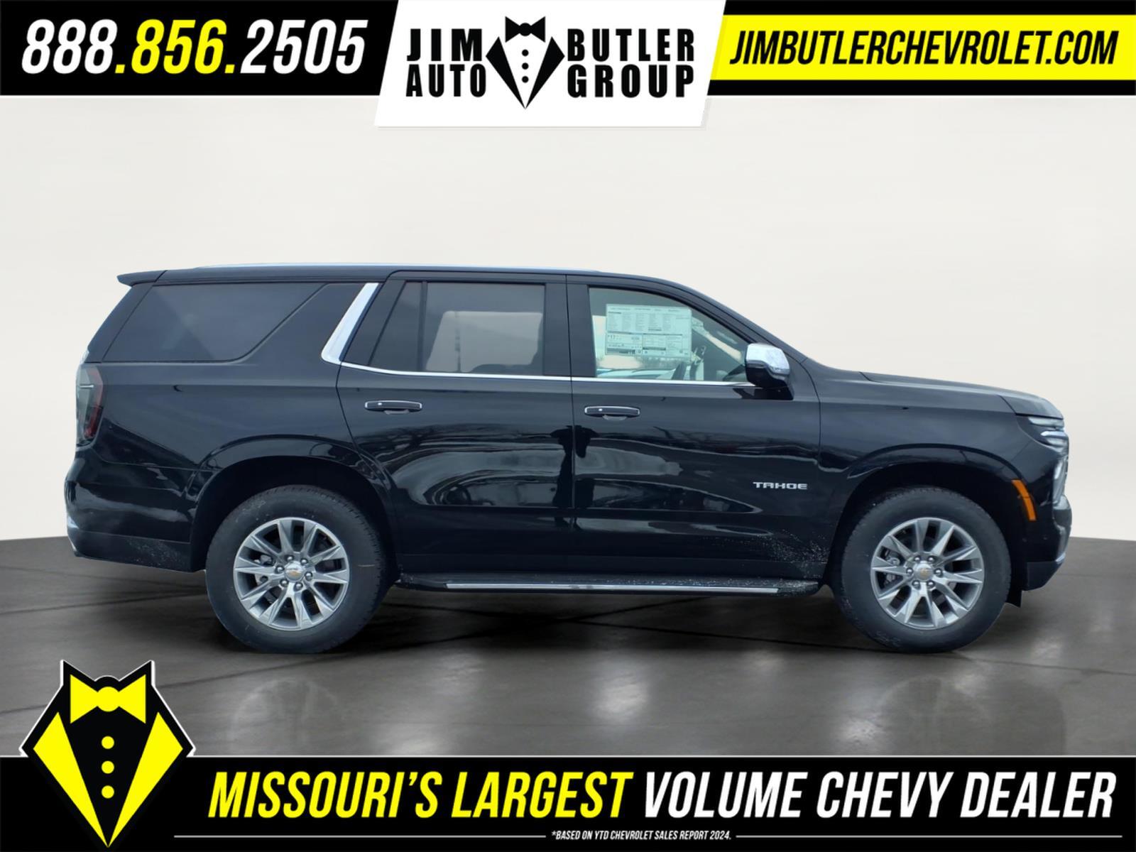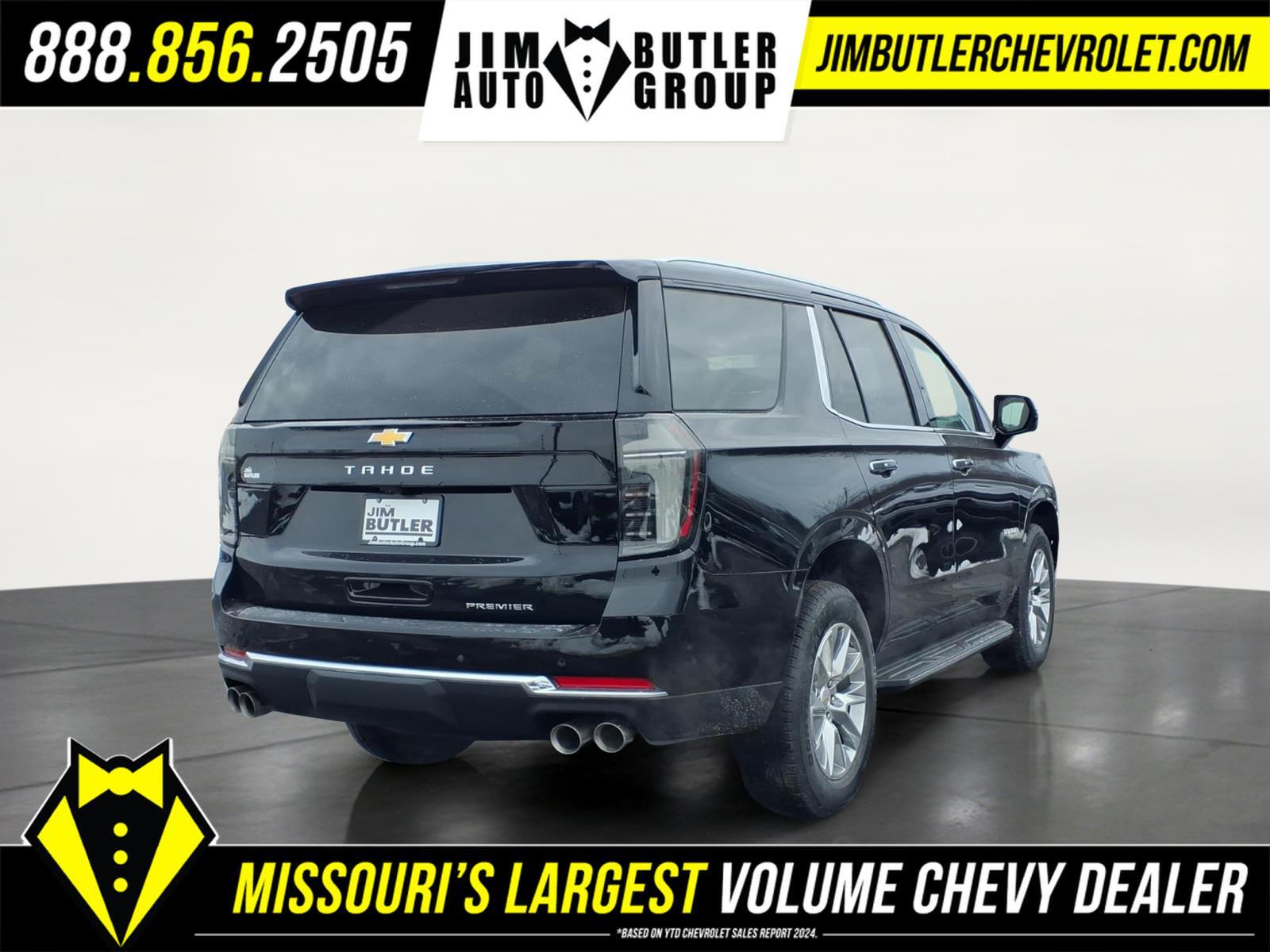 2026 Chevrolet Tahoe Premier Premier Black 4WD 10-Speed Automatic with Overdrive EcoTec3 5.3L V8 Recent Arrival! Please call today (888) 475-3191. We are proud to be a GM Mark of Excellence Dealership. Come see why we are the #1 Chevrolet dealership in the Midwest. On top of that we have also been awarded Dealer of the year the last 8 years. Proudly serving: St. Louis, South County, Webster Groves, Creve Coeur, Kirkwood, Maryland Heights, Sullivan, Rolla, Columbia, Fenton, Chesterfield, St. Charles, Kansas City, Springfield, Jefferson City, and all of great Missouri and Illinois. While we make every attempt to ensure pricing accuracy. Dealer not responsible for computer or human error, dealer reserves the right to change prices due to human or computer error. In order to put a 24 hour hold deposit on vehicles, Financing must be secured thru Jim Butler Chevrolet Business Office and Cash Deals must be Electronically Transferred within Six Hours. Advanced Trailering Package (Blind Zone Steering Assist with Trailering, Hitch View with Pan/Zoom Image Adjustment, and Smart Trailer Integration Indicator), License Plate Front Mounting Package, Max Trailering Package (2-Speed Active Electronic AutoTrac Transfer Case, Hill Descent Control, and Integrated Trailer Brake Controller), Preferred Equipment Group 1LZ (1st and 2nd Row Color-Keyed Carpeted Floor Mats, 20x 9Polished Aluminum Wheels, 3-Spoke Wrapped Steering Wheel, 3rd Row 60/40 Power-Folding Split-Bench Seat, Auto-Dimming Inside Rear-View Mirror, Bose 10-Speaker Centerpoint Surround Audio System Feature, Bright Front and Rear Door Sill Plates, Chrome Door Handles with Body-Color Strip, Chrome Mirror Caps, Color-Keyed Carpeting Floor Covering, Dual Exhaust System, Floor Console, Front Bucket Seats, Front LED Fog Lamps, Frontal Driver and Outboard Passenger Airbags, Heated 2nd Row Outboard Seats, Heated Steering Wheel, Interior Camera, Key Card, LED Headlamps with LED Daytime Running Lamps, LED Tail Lamps, Magnetic Ride Control Suspension, Memory Settings, Outside Heated Power-Adjustable Mirrors, Power Release 2nd Row Bucket Seats, Power Tilt and Telescopic Steering Column, Rear Power Liftgate, Remote Start, SiriusXM with 360L Trial Subscription, Universal Home Remote, and Wireless Phone Charging), Premium Liner Protection Package (3rd Row All-Weather Floor Liners, All-Weather Cargo Mat, and First and Second Rows Premium Floor Liners), Sun and Tow Package (Dual-Pane Power Panoramic Sunroof), 10 Speakers, 3