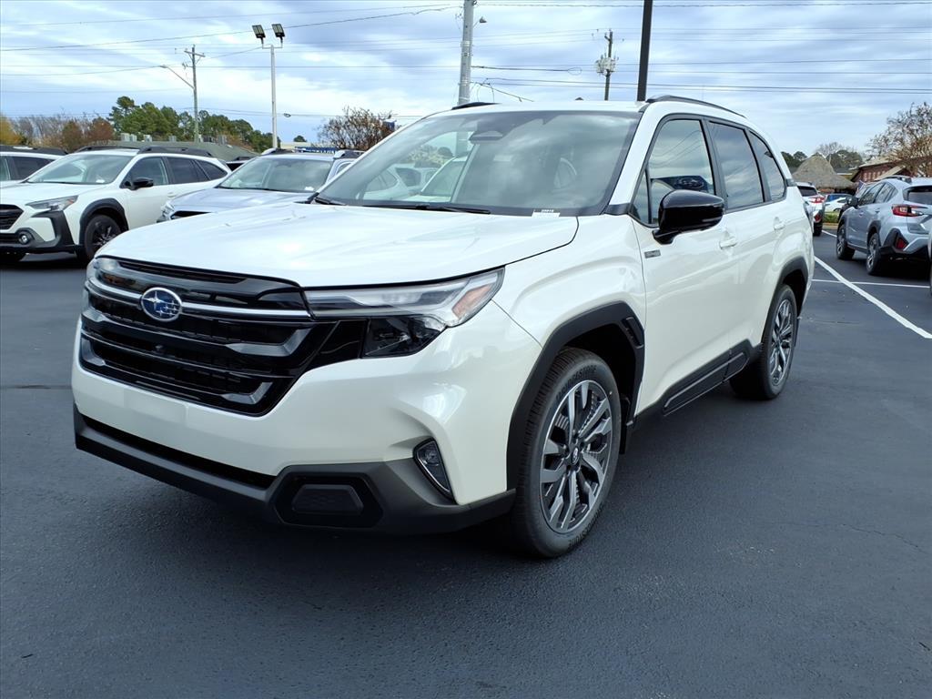 The 2025 Subaru Forester Touring Hybrid is a vehicle that is sure to impress. This all-wheel drive, 2.5 liter 4 cylinder engine has a crystal white pearl exterior and a touring black interior. It has a fuel economy of 35 mpg in the city and 34 mpg on the highway, making it an efficient choice for any driver. It also has a crash test rating of 5 out of 5 stars, making it even safer. The vehicle also features a touch screen display, Bluetooth audio connection, blind spot sensor, hill start assist, and full time four wheel drive for added convenience. Other features include navigation system with voice recognition, navigation with touch screen display, Bluetooth phone connectivity, and leather-trimmed seats for added comfort. The 2025 Subaru Forester Touring Hybrid is the perfect combination of style, safety, and performance. Contact Details: Sam Johnson's Cross Creek Subaru, 497 McPherson Church Road, FAYETTEVILLE, NC, 28303, crosscreeksubaru@eleadtrack.net, 9108645240.