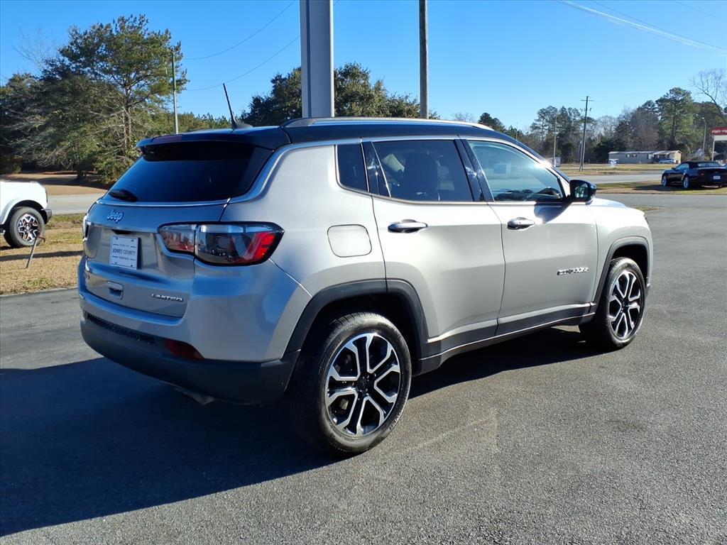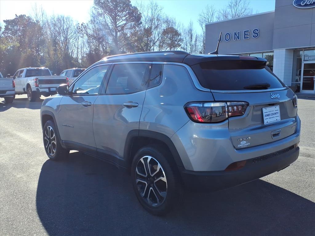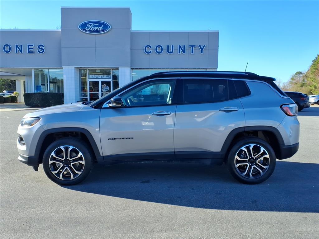 Vehicle Details2022 Jeep Compass Limited - 4WD, 2.4L 4-Cylinder, 41,145 miles - Trenton, NC Ready for adventure and built for comfort, this 2022 Jeep Compass Limited blends capability with upscale features. Equipped with a fuel-efficient 2.4L 4-cylinder gasoline engine and four-wheel drive, it delivers confident traction in variable North Carolina weather while remaining nimble around town. With just 41,145 miles, this Jeep Compass has plenty of life left and comes with the best price in the area. Interior tech and safety are strong points: enjoy Apple CarPlay for seamless smartphone integration, Hands-Free Bluetooth for safer calls and media, and XM Radio for endless entertainment options. Advanced safety features like Forward Collision Warning help protect you and your passengers on every drive. This vehicle also includes a CARFAX Clean Report, giving you added confidence in its history and condition. Comfortable, upscale touches and efficient performance make this Limited trim a smart choice for daily commuting, weekend getaways, or family errands. Located in Trenton, NC, this Jeep Compass Limited offers exceptional value and capability-priced to sell quickly. Contact us today to schedule a test drive and secure the best-priced 2022 Jeep Compass Limited near Trenton. Financing options available for qualified buyers.EquipmentThe Jeep Compass has auto-adjust speed for safe following. The vehicle comes equipped with Android Auto for seamless smartphone integration on the road. This 2022 Jeep Compass is equipped with the latest generation of XM/Sirius Radio. The Jeep Compasss Forward Collision Warning feature alerts drivers to potential front-end collisions. This mid-size suv features a hands-free Bluetooth phone system. Our dealership has already run the CARFAX report and it is clean. A clean CARFAX is a great asset for resale value in the future. This model offers Automatic Climate Control for personalized comfort. Keep your hands warm all winter with a heated steering wheel in this mid-size suv . This Jeep Compass offers Apple CarPlay for seamless connectivity. The leather seats in the Jeep Compass are a must for buyers looking for comfort, durability, and style. See whats behind you with the back up camera on it. Never get into a cold vehicle again with the remote start feature on this vehicle.PackagesQuick Order Package 2GG. Billet Silver Metallic CC. **Equipment listed is based on original vehicle