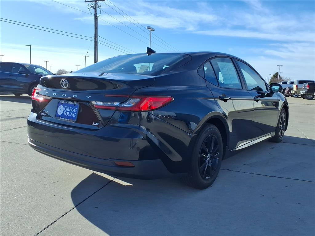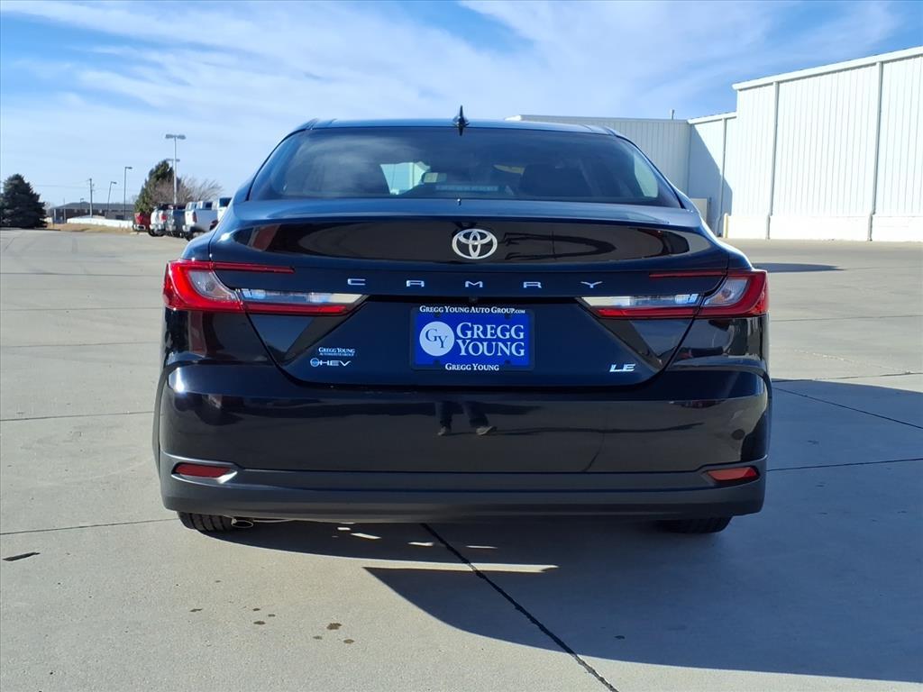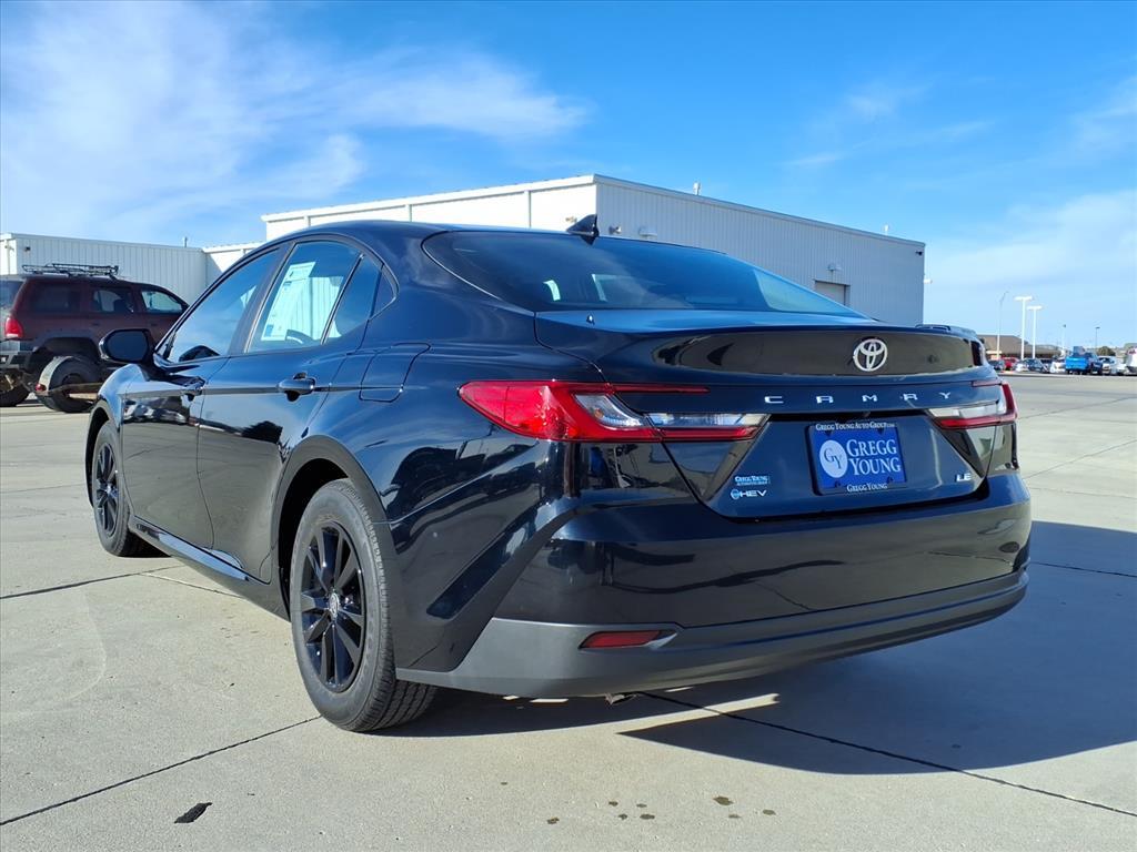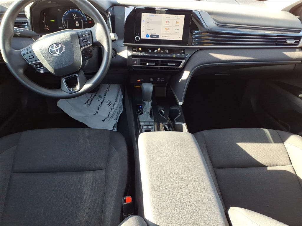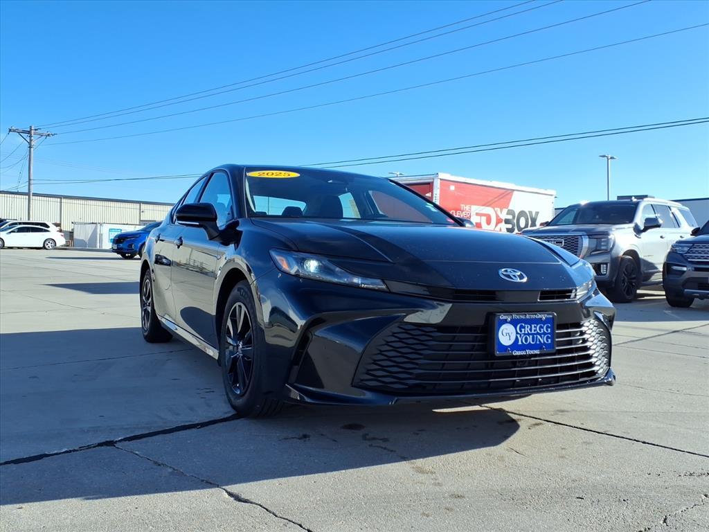 Our 2025 Toyota Camry LE Sedan blends refined performance and an elevated design in Midnight Black Metallic! Powered by a 2.5 Liter 4 Cylinder and 2 Electric Motors offering a combined 225hp to an eCVT with Sport, Eco, Normal, and EV driving modes. Also impressively efficient, this Front Wheel Drive sedan achieves nearly 53mpg in the city and nearly 51mpg on the highway. Our Camry shows its stylish side with an aggressive grille, LED lighting, alloy wheels, and heated power mirrors with built-in turn signals. Come see our LE cabin and experience its modern comfort for yourself. Youll find supportive fabric seats, a multifunction steering wheel, dual-zone automatic climate control, pushbutton ignition, and keyless access. Looking to connect on the go Check out the smart infotainment system with an 8-inch touchscreen, 7-inch driver display, wireless Apple CarPlay/Android Auto, WiFi compatibility, Bluetooth, wireless charging, voice control, Cloud Navigation compatibility, and six-speaker audio. Theres no substitute for intelligent safety, so Toyota supplies Proactive Driving Assist, blind-spot monitoring, automatic braking, adaptive cruise control, lane-keeping assistance, a rearview camera, pedestrian detection, and more. You deserve our Camry LE because every day deserves more fun! Save this Page and Call for Availability. We Know You Will Enjoy Your Test Drive Towards Ownership!