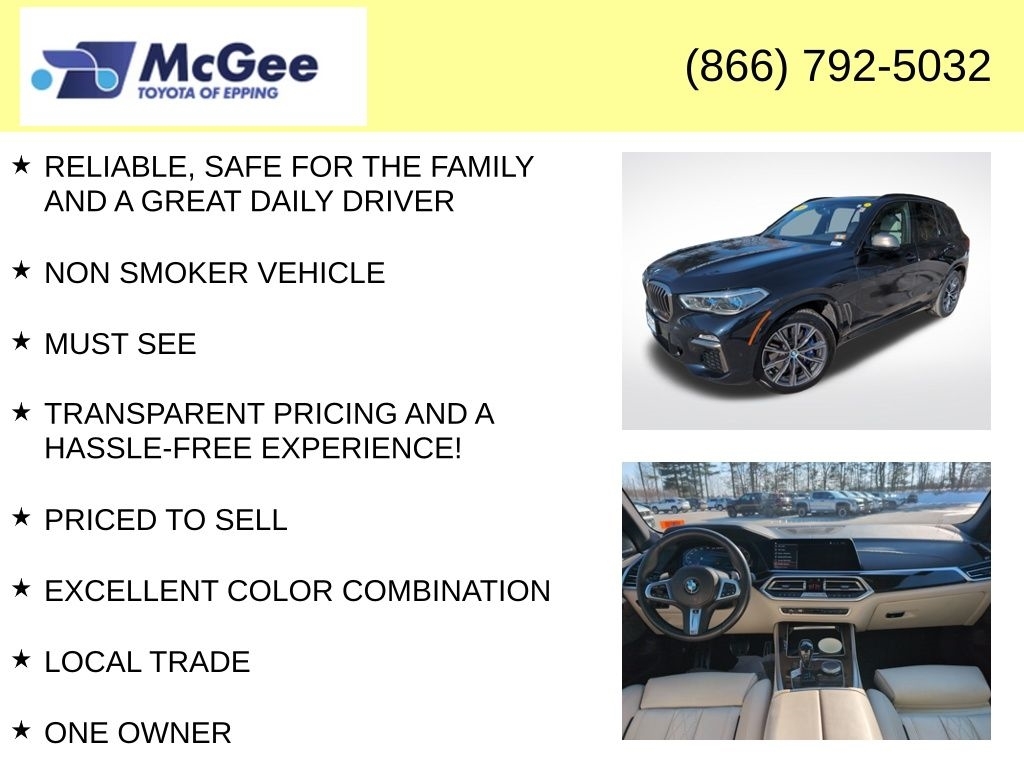 Recent Arrival! New Price! RELIABLE, SAFE FOR THE FAMILY AND A GREAT DAILY DRIVER, NON SMOKER VEHICLE, MUST SEE, TRANSPARENT PRICING AND A HASSLE-FREE EXPERIENCE!, PRICED TO SELL, EXCELLENT COLOR COMBINATION, LOCAL TRADE, ONE OWNER, $1,287.68 WAS SPENT IN PROFESSIONAL SHOP WORK SO THIS VEHICLE MEETS OUR STANDARDS FOR SAFETY, DEPENDABILITY,, MOUNT & BALANCED 2-NEW TIRES, Ivory White Leather. At McGee Toyota Of Epping we want you to know that all our vehicles are priced at a competitive value position to the market. We use an independent 3rd party software to research internet listings on all vehicles in the market so we can ensure that our prices are the most competitive out there. We do this simply so people choose us when they start searching for their next car. CARFAX One-Owner. 2020 BMW X5 M50i 4D Sport Utility Carbon Black Metallic AWD 8-Speed Automatic 4.4L V8 DOHC 32V Twin Turbocharged McGee Toyota is a Family-Owned Business and we enjoy assisting all of our guests buying their next vehicle! Awards: * 2020 KBB.com Best Buy Awards
