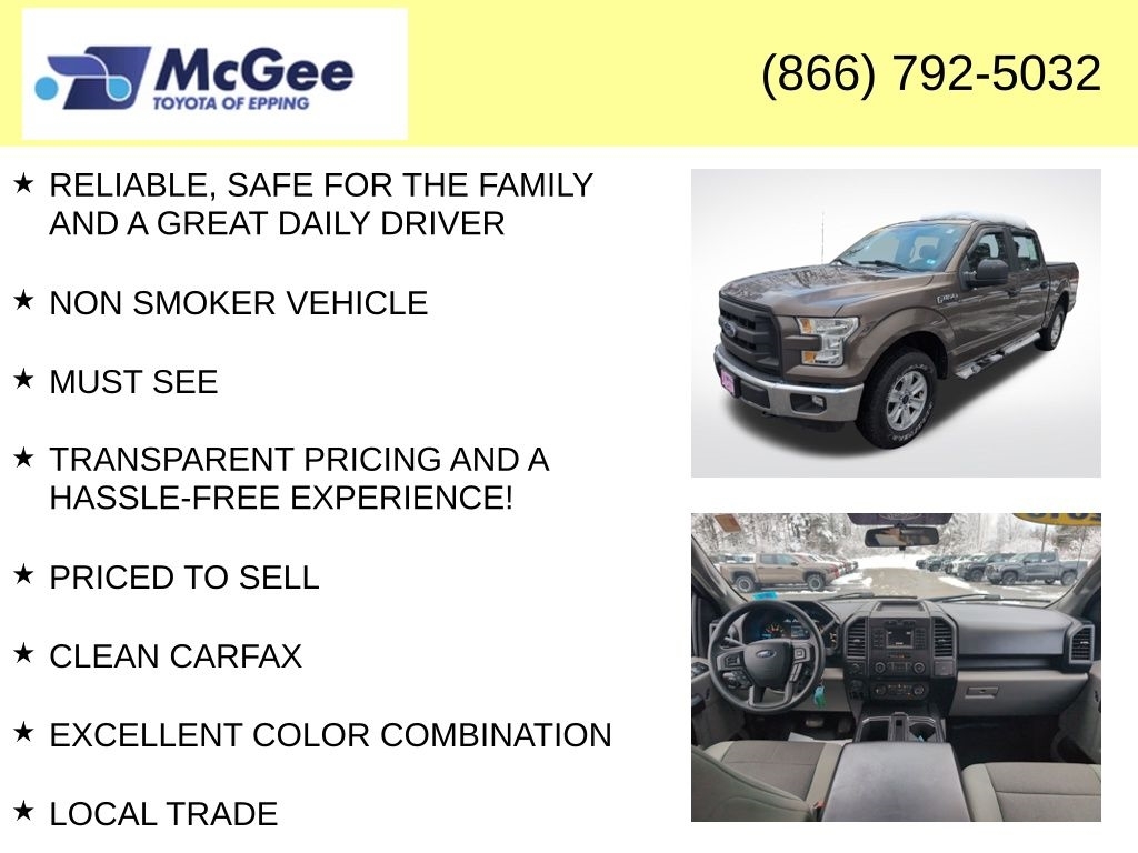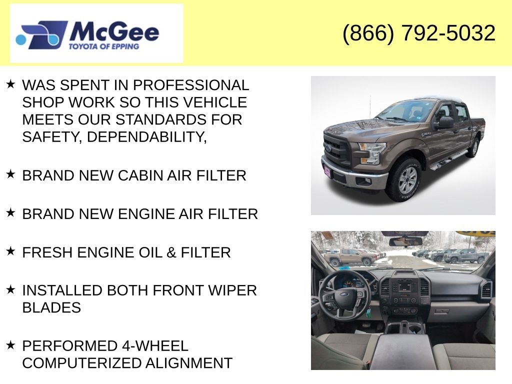 Recent Arrival! New Price! RELIABLE, SAFE FOR THE FAMILY AND A GREAT DAILY DRIVER, NON SMOKER VEHICLE, MUST SEE, TRANSPARENT PRICING AND A HASSLE-FREE EXPERIENCE!, PRICED TO SELL, CLEAN CARFAX, EXCELLENT COLOR COMBINATION, LOCAL TRADE, $3208.60 WAS SPENT IN PROFESSIONAL SHOP WORK SO THIS VEHICLE MEETS OUR STANDARDS FOR SAFETY, DEPENDABILITY,, BRAND NEW CABIN AIR FILTER, BRAND NEW ENGINE AIR FILTER, FRESH ENGINE OIL & FILTER, INSTALLED BOTH FRONT WIPER BLADES, PERFORMED 4-WHEEL COMPUTERIZED ALIGNMENT, ROTATED & BALANCED ALL TIRES, PERFORMED BRAKE FLUID SERVICE, PERFORMED DIFFERENTIAL GEAR OIL EXCHANGE, BRAND NEW SPARK PLUGS INSTALLED, PERFORMED COOLANT FLUSH SERVICE, REPLACED TRANSMISSION COOLER AND ALL FOUR COOLER LINES, 4WD, ABS brakes, Compass, Electronic Stability Control, Low tire pressure warning, Traction control. At McGee Toyota Of Epping we want you to know that all our vehicles are priced at a competitive value position to the market. We use an independent 3rd party software to research internet listings on all vehicles in the market so we can ensure that our prices are the most competitive out there. We do this simply so people choose us when they start searching for their next car. Clean CARFAX. 2016 Ford F-150 XL 4D SuperCrew Caribou Metallic 4WD 6-Speed Automatic Electronic 5.0L V8 FFV McGee Toyota is a Family-Owned Business and we enjoy assisting all of our guests buying their next vehicle! Awards: * 2016 KBB.com Brand Image Awards