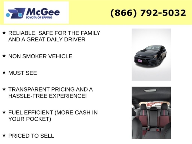 RELIABLE, SAFE FOR THE FAMILY AND A GREAT DAILY DRIVER, NON SMOKER VEHICLE, MUST SEE, TRANSPARENT PRICING AND A HASSLE-FREE EXPERIENCE!, FUEL EFFICIENT (MORE CASH IN YOUR POCKET), PRICED TO SELL, TOYOTA CERTIFICATION GIVES BUYERS PEACE OF MIND WITH A RIGOROUS 160-POINT INSPECTION, EXTENDED FACT, CLEAN CARFAX, LOCAL TRADE, ONE OWNER, BRAND NEW CABIN AIR FILTER, BRAND NEW ENGINE AIR FILTER, INSTALLED BOTH FRONT WIPER BLADES, MOUNT & BALANCED 4-NEW TIRES, PERFORMED 4-WHEEL COMPUTERIZED ALIGNMENT, PERFORMED BRAKE FLUID SERVICE, $2,082.41 WAS SPENT TO MECHANICALLY REACH TOYOTA CERTIFICATION STANDARDS!. At McGee Toyota Of Epping we want you to know that all our vehicles are priced at a competitive value position to the market. We use an independent 3rd party software to research internet listings on all vehicles in the market so we can ensure that our prices are the most competitive out there. We do this simply so people choose us when they start searching for their next car. CARFAX One-Owner. Clean CARFAX. 2024 Toyota Corolla SE 4D Sedan Blueprint/Midnight Black Metallic FWD CVT 2.0L I4 DOHC 16V Certified. Toyota Gold Certified Details: * 160 Point Inspection * Transferable Warranty * Vehicle History * Limited Warranty: 12 Month/12,000 Mile Limited Comprehensive Warranty: 12 Month/12,000 Mile (whichever comes first) from certified purchase date * Roadside Assistance * Powertrain Limited Warranty: 84 Month/100,000 Mile (whichever comes first) from TCUV purchase date * Roadside Assistance for 7 Year / 100,000 Mile. Standard New-Car Financing Rates Available. Warranty honored at over 1,400 Toyota dealers in the continental U.S. & Canada. Trade-ins accepted. Trouble-free handling of your transaction, including DMV paperwork * Warranty Deductible: $0 McGee Toyota is a Family-Owned Business and we enjoy assisting all of our guests buying their next vehicle!