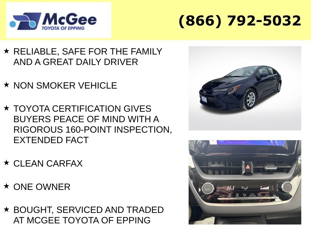 RELIABLE, SAFE FOR THE FAMILY AND A GREAT DAILY DRIVER, NON SMOKER VEHICLE, TOYOTA CERTIFICATION GIVES BUYERS PEACE OF MIND WITH A RIGOROUS 160-POINT INSPECTION, EXTENDED FACT, CLEAN CARFAX, ONE OWNER, BOUGHT, SERVICED AND TRADED AT MCGEE TOYOTA OF EPPING, FACTORY MAINTENANCE UP TO DATE, BRAND NEW CABIN AIR FILTER, BRAND NEW ENGINE AIR FILTER, FRESH ENGINE OIL & FILTER, INSTALLED BOTH FRONT WIPER BLADES, ROTATED & BALANCED ALL TIRES, RESURFACED FRONT ROTORS, $1,473.27 WAS INVESTED IN MECHANICAL WORK TO MAKE THIS A FRONT LINEREADY VEHICLE, ENSURING YOURE BUYING A SAFER, MORE RELIABLE, AND BETTER-PERFORMING USED CAR YOU CAN TRUST., 2024 Toyota Corolla LE Apple CarPlay Backup Camera Adaptive Cruise Control Toyota Safety Sense Excellent MPG! This 2024 Toyota Corolla LE offers outstanding fuel efficiency, legendary Toyota reliability, and modern technology in a sleek compact sedan. Powered by a 2.0L 4-cylinder engine paired with a CVT automatic transmission, the Corolla delivers smooth driving with impressive MPG perfect for commuting and daily driving. Equipped with Toyota Safety Sense 3.0, this Corolla includes advanced driver-assist features designed to keep you safe and confident on the road. Key Features Include: Apple CarPlay & Android Auto Backup Camera Adaptive Cruise Control Lane Departure Alert with Steering Assist Pre-Collision System with Pedestrian Detection Blind Spot Monitor (if equipped) Bluetooth Hands-Free & Audio Streaming Touchscreen Display Keyless Entry Push Button Start (if equipped) LED Headlights Automatic High Beams USB-C Charging Ports Steering Wheel Audio Controls Spacious Rear Seat Large Trunk Space The Toyota Corolla LE is one of the best-selling sedans in the world thanks to its low ownership cost, exceptional reliability, and strong resale value. Whether youre buying your first car or upgrading your daily driver, this Corolla checks all the boxes. Fully inspected, professionally detailed, and ready to drive home today! Corollas sell fast schedule your test drive now!, ABS brakes, Electronic Stability Control, Illuminated entry, Low tire pressure warning, Remote keyless entry, Traction control. At McGee Toyota Of Epping we want you to know that all our vehicles are priced at a competitive value position to the market. We use an independent 3rd party software to research internet listings on all vehicles in the market so we can ensure that our prices are the most competitive out there. We do this simply so people choose us when the