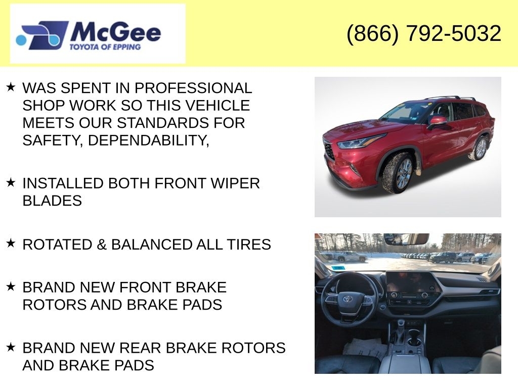 Recent Arrival! RELIABLE, SAFE FOR THE FAMILY AND A GREAT DAILY DRIVER, NON SMOKER VEHICLE, MUST SEE, TRANSPARENT PRICING AND A HASSLE-FREE EXPERIENCE!, FUEL EFFICIENT (MORE CASH IN YOUR POCKET), PRICED TO SELL, WAS SPENT IN PROFESSIONAL SHOP WORK SO THIS VEHICLE MEETS OUR STANDARDS FOR SAFETY, DEPENDABILITY,, INSTALLED BOTH FRONT WIPER BLADES, ROTATED & BALANCED ALL TIRES, BRAND NEW FRONT BRAKE ROTORS AND BRAKE PADS, BRAND NEW REAR BRAKE ROTORS AND BRAKE PADS, 2.5L I4 PDI Hybrid DOHC 16V LEV3-SULEV30, 11 Speakers, Navigation system: Drive Connect Cloud Navigation (1-year trial subscription), Panoramic View Camera, Panoramic View Monitor. At McGee Toyota Of Epping we want you to know that all our vehicles are priced at a competitive value position to the market. We use an independent 3rd party software to research internet listings on all vehicles in the market so we can ensure that our prices are the most competitive out there. We do this simply so people choose us when they start searching for their next car. CARFAX One-Owner. 2023 Toyota Highlander Hybrid Limited 4D Sport Utility Ruby Flare Pearl AWD eCVT 2.5L I4 PDI Hybrid DOHC 16V LEV3-SULEV30 McGee Toyota is a Family-Owned Business and we enjoy assisting all of our guests buying their next vehicle!