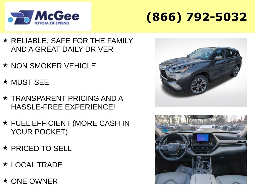 Recent Arrival! TOYOTA CERTIFICATION GIVES BUYERS PEACE OF MIND WITH A RIGOROUS 160-POINT INSPECTION! RELIABLE, SAFE FOR THE FAMILY AND A GREAT DAILY DRIVER, NON SMOKER VEHICLE, MUST SEE, TRANSPARENT PRICING AND A HASSLE-FREE EXPERIENCE!, FUEL EFFICIENT (MORE CASH IN YOUR POCKET), PRICED TO SELL, LOCAL TRADE, ONE OWNER, $2,976.02 WAS SPENT IN PROFESSIONAL SHOP WORK SO THIS VEHICLE MEETS OUR STANDARDS FOR SAFETY, DEPENDABILITY, BRAND NEW CABIN AIR FILTER, BRAND NEW ENGINE AIR FILTER, FRESH ENGINE OIL & FILTER, MOUNT & BALANCED 4-NEW TIRES, PERFORMED 4-WHEEL COMPUTERIZED ALIGNMENT, BRAND NEW FRONT BRAKE ROTORS AND BRAKE PADS, BRAND NEW REAR BRAKE ROTORS AND BRAKE PADS, AWD, ABS brakes, Active Cruise Control, Alloy wheels, Electronic Stability Control, Front dual zone A/C, Heated door mirrors, Heated Front Bucket Seats, Heated front seats, Illuminated entry, Low tire pressure warning, Power Liftgate, Power moonroof, Remote keyless entry, Traction control. At McGee Toyota Of Epping we want you to know that all our vehicles are priced at a competitive value position to the market. We use an independent 3rd party software to research internet listings on all vehicles in the market so we can ensure that our prices are the most competitive out there. We do this simply so people choose us when they start searching for their next car. CARFAX One-Owner. Clean CARFAX. 2023 Toyota Highlander XLE 4D Sport Utility Magnetic Gray Metallic AWD 8-Speed Automatic 2.4L I4 PDI Turbocharged DOHC 16V LEV3-SULEV30 265hp McGee Toyota is a Family-Owned Business and we enjoy assisting all of our guests buying their next vehicle!