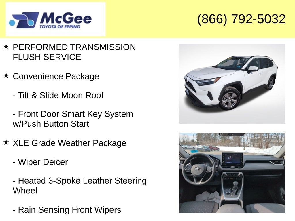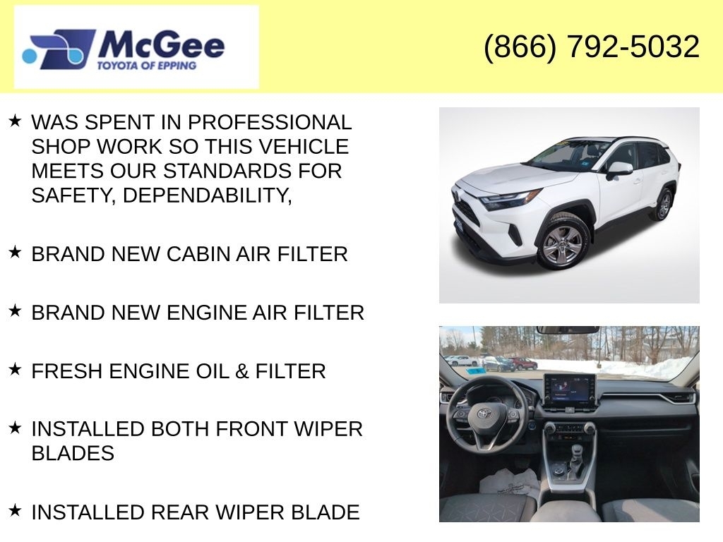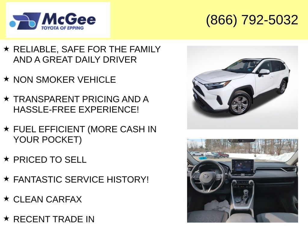Recent Arrival! RELIABLE, SAFE FOR THE FAMILY AND A GREAT DAILY DRIVER, NON SMOKER VEHICLE, TRANSPARENT PRICING AND A HASSLE-FREE EXPERIENCE!, FUEL EFFICIENT (MORE CASH IN YOUR POCKET), PRICED TO SELL, FANTASTIC SERVICE HISTORY!, CLEAN CARFAX, RECENT TRADE IN, WAS SPENT IN PROFESSIONAL SHOP WORK SO THIS VEHICLE MEETS OUR STANDARDS FOR SAFETY, DEPENDABILITY,, BRAND NEW CABIN AIR FILTER, BRAND NEW ENGINE AIR FILTER, FRESH ENGINE OIL & FILTER, INSTALLED BOTH FRONT WIPER BLADES, INSTALLED REAR WIPER BLADE, PERFORMED TRANSMISSION FLUSH SERVICE, 2.5L 4-Cylinder, Anti-Theft System, Convenience Package, Door Edge Guard (TMS), Front Door Smart Key System w/Push Button Start, Front Seat Heating, Heated 3-Spoke Leather Steering Wheel, Integrated Panoramic Backup Camera, Radio: Audio Plus, Rain Sensing Front Wipers, Tilt & Slide Moon Roof, Wiper Deicer, XLE Grade Weather Package. At McGee Toyota Of Epping we want you to know that all our vehicles are priced at a competitive value position to the market. We use an independent 3rd party software to research internet listings on all vehicles in the market so we can ensure that our prices are the most competitive out there. We do this simply so people choose us when they start searching for their next car. CARFAX One-Owner. Clean CARFAX. 2022 Toyota RAV4 Hybrid XLE 4D Sport Utility White AWD eCVT 2.5L 4-Cylinder McGee Toyota is a Family-Owned Business and we enjoy assisting all of our guests buying their next vehicle!