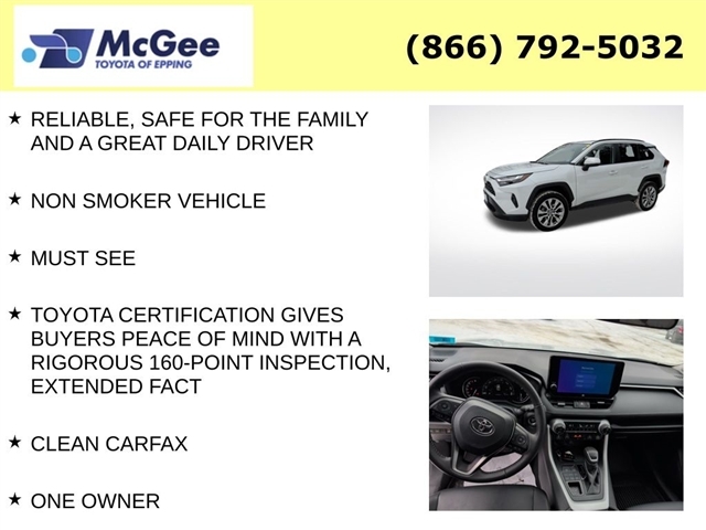 Recent Arrival! RELIABLE, SAFE FOR THE FAMILY AND A GREAT DAILY DRIVER, NON SMOKER VEHICLE, MUST SEE, TOYOTA CERTIFICATION GIVES BUYERS PEACE OF MIND WITH A RIGOROUS 160-POINT INSPECTION, EXTENDED FACT, CLEAN CARFAX, ONE OWNER, BOUGHT, SERVICED AND TRADED AT MCGEE TOYOTA OF EPPING, $2,007.14 WAS SPENT IN PROFESSIONAL SHOP WORK SO THIS VEHICLE MEETS OUR STANDARDS FOR SAFETY, DEPENDABILITY,, BRAND NEW CABIN AIR FILTER, BRAND NEW ENGINE AIR FILTER, FRESH ENGINE OIL & FILTER, INSTALLED BOTH FRONT WIPER BLADES, PERFORMED 4-WHEEL COMPUTERIZED ALIGNMENT, ROTATED & BALANCED ALL TIRES, BRAND NEW FRONT BRAKE ROTORS AND BRAKE PADS, 2024 Toyota RAV4 XLE Premium AWD Power Liftgate Heated Seats Sunroof Apple CarPlay Toyota Safety Sense! This 2024 Toyota RAV4 XLE Premium delivers the perfect balance of style, comfort, and capability in one of Toyotas best-selling SUVs. Powered by a 2.5L 4-cylinder engine paired with an 8-speed automatic transmission, the RAV4 provides smooth performance, excellent fuel economy, and dependable reliability. The XLE Premium trim upgrades your drive with upscale interior finishes and convenience features designed to enhance every trip. Key Features Include: All-Wheel Drive (if equipped) Power Moonroof Power Liftgate Heated Front Seats SofTex Leather-Trimmed Seats Power Driver Seat with Lumbar Support Apple CarPlay & Android Auto Touchscreen Infotainment System Backup Camera Blind Spot Monitor with Rear Cross Traffic Alert Adaptive Cruise Control Lane Keep Assist Pre-Collision System with Pedestrian Detection Push Button Start Smart Key Entry Dual-Zone Automatic Climate Control LED Headlights Premium Alloy Wheels Roof Rails The Toyota RAV4 XLE Premium is known for its strong resale value, low ownership cost, and everyday versatility making it ideal for commuting, family trips, and weekend adventures. Fully serviced, professionally detailed, and ready for immediate delivery! High-demand RAV4s sell quickly schedule your test drive today!, AWD, Black w/SofTex Seat Trim. At McGee Toyota Of Epping we want you to know that all our vehicles are priced at a competitive value position to the market. We use an independent 3rd party software to research internet listings on all vehicles in the market so we can ensure that our prices are the most competitive out there. We do this simply so people choose us when they start searching for their next car. CARFAX One-Owner. Clean CARFAX. 2024 Toyota RAV4 XLE Premium 4D Sport Utility Wind Chill Pearl AWD 8-Sp