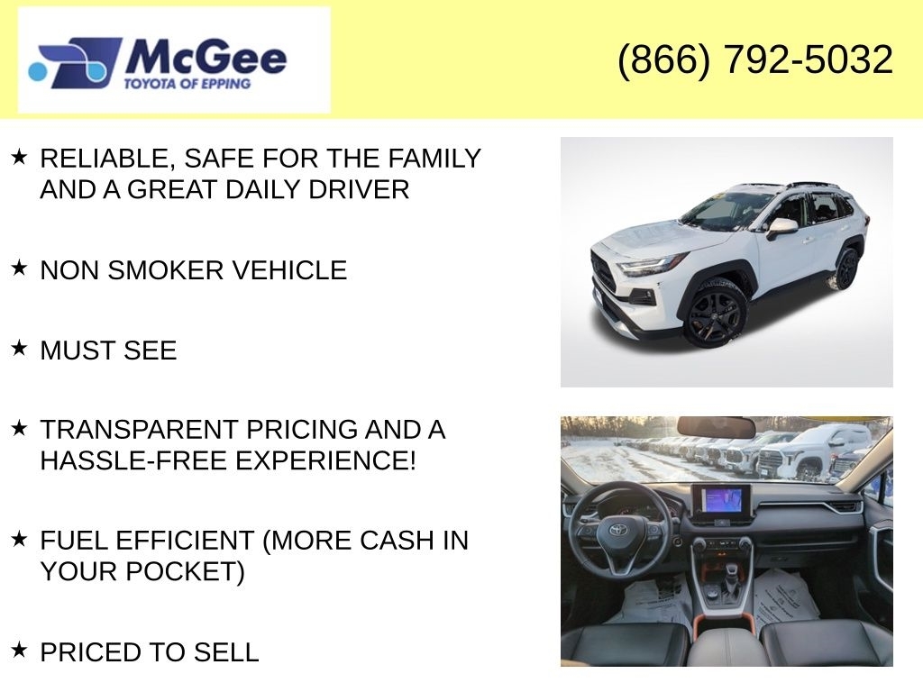 RELIABLE, SAFE FOR THE FAMILY AND A GREAT DAILY DRIVER, NON SMOKER VEHICLE, MUST SEE, TRANSPARENT PRICING AND A HASSLE-FREE EXPERIENCE!, FUEL EFFICIENT (MORE CASH IN YOUR POCKET), PRICED TO SELL, TOYOTA CERTIFICATION GIVES BUYERS PEACE OF MIND WITH A RIGOROUS 160-POINT INSPECTION, EXTENDED FACT, CLEAN CARFAX, EXCELLENT COLOR COMBINATION, ONE OWNER, BRAND NEW CABIN AIR FILTER, BRAND NEW ENGINE AIR FILTER, FRESH ENGINE OIL & FILTER, INSTALLED BOTH FRONT WIPER BLADES, INSTALLED REAR WIPER BLADE, MOUNT & BALANCED 4-NEW TIRES, PERFORMED 4-WHEEL COMPUTERIZED ALIGNMENT, REAR DIFFERENTIAL FLUID SERVICE COMPLETED, FRONT DIFFERENTIAL FLUID SERVICE COMPLETED, WAS SPENT PREPARING THIS VEHICLE FOR SALE INCLUDING, PERFORMED FUEL INDUCTION SERVICE, PERFORMED HVAC REFRESHER SERVICE, WE SPENT $2,623.03 IN PROFESSIONAL SHOP WORK SO THIS VEHICLE MEETS OUR STANDARDS FOR SAFETY, DEPENDABILITY, INSPECTION AND LONG-TERM OWNERSHIPTHIS IS PEACE OF MIND, NOT SHORTCUTS., 2024 Toyota RAV4 Adventure AWD Rugged Style All-Terrain Capability Loaded Take on every road with confidence in this 2024 Toyota RAV4 Adventure AWD, the boldest and most capable non-TRD RAV4 in the lineup. Designed for drivers who want off-road-inspired styling, enhanced AWD capability, and everyday comfort, the RAV4 Adventure is perfect for New England weather and weekend escapes. Adventure-Grade Performance & Capability 2.5-Liter 4-Cylinder Engine 203 HP Dynamic Torque Vectoring All-Wheel Drive Multi-Terrain Select (Mud & Sand / Rock & Dirt / Snow) Higher-Capacity Cooling System (Adventure exclusive) Towing Capacity up to 3,500 lbs Selectable Drive Modes (Eco Normal Sport) Built to handle rough roads, trailers, and all-season driving with ease. Interior & Comfort Adventure Trim Adventure-Specific Interior Accents Water-Resistant SofTex Seats Power Drivers Seat Heated Front Seats (if equipped) Power Moonroof (if equipped) All-Weather Floor Liners 60/40 Split-Folding Rear Seats Spacious Cargo Area with Tie-Downs Technology & Safety 8 Touchscreen with Wireless Apple CarPlay & Android Auto Wireless Phone Charger Backup Camera with Dynamic Gridlines Toyota Safety Sense 2.5: Pre-Collision System with Pedestrian Detection Lane Tracing Assist Dynamic Radar Cruise Control Lane Departure Alert with Steering Assist Road Sign Assist Blind Spot Monitor with Rear Cross-Traffic Alert Why Buy This 2024 RAV4 Adventure The RAV4 Adventure offers the perfect balance of rugged capability and daily comfort more trail-ready than an XLE,