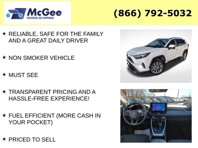 RELIABLE, SAFE FOR THE FAMILY AND A GREAT DAILY DRIVER, NON SMOKER VEHICLE, MUST SEE, TRANSPARENT PRICING AND A HASSLE-FREE EXPERIENCE!, FUEL EFFICIENT (MORE CASH IN YOUR POCKET), PRICED TO SELL, FANTASTIC SERVICE HISTORY!, CLEAN CARFAX, EXCELLENT COLOR COMBINATION, ONE OWNER, FACTORY MAINTENANCE UP TO DATE, BRAND NEW CABIN AIR FILTER, BRAND NEW ENGINE AIR FILTER, FRESH ENGINE OIL & FILTER, INSTALLED BOTH FRONT WIPER BLADES, INSTALLED REAR WIPER BLADE, MOUNT & BALANCED 4-NEW TIRES, PERFORMED 4-WHEEL COMPUTERIZED ALIGNMENT, PERFORMED BRAKE FLUID SERVICE, $1,443.16 WAS SPENT ON MECHANICAL WORK AND WEAR & TEAR REPLACEMENT ITEMS FOR TOYOTA CERTIFICATION. WHAT A GREAT VEHICLE TO OWN!, 2024 Toyota RAV4 Limited Premium Comfort, Advanced Technology, and Toyotas Trusted Capability The 2024 Toyota RAV4 Limited delivers top-tier refinement, advanced safety, and everyday versatility in Toyotas best-selling SUV. Powered by a dependable 2.5L 4-cylinder engine paired with an 8-speed automatic transmission, the RAV4 Limited offers a smooth ride, excellent fuel efficiency, and confident performance whether youre commuting, traveling, or tackling New England weather. Available All-Wheel Drive enhances traction and control on any road. Inside, the Limited trim surrounds you with upscale comfort, featuring SofTex-trimmed heated front seats, ventilated seat availability, dual-zone climate control, a digital rearview mirror, and a premium 11-speaker JBL audio system. The cabin is highlighted by a large 10.5-inch touchscreen, wireless Apple CarPlay & Android Auto, wireless charging, and smart storage for daily convenience. Safety comes standard with Toyota Safety Sense 2.5 , including Pre-Collision System with Pedestrian Detection, Full-Speed Dynamic Radar Cruise Control, Lane Tracing Assist, Lane Departure Alert with Steering Assist, Road Sign Assist, and Automatic High Beamsgiving drivers confidence on every drive. With bold styling, a luxurious interior, and Toyotas legendary reliability, the 2024 RAV4 Limited stands at the top of the segment as a smart, upscale, and adventure-ready SUV., AWD, Black w/SofTex Seat Trim. At McGee Toyota Of Epping we want you to know that all our vehicles are priced at a competitive value position to the market. We use an independent 3rd party software to research internet listings on all vehicles in the market so we can ensure that our prices are the most competitive out there. We do this simply so people choose us when they start searching for