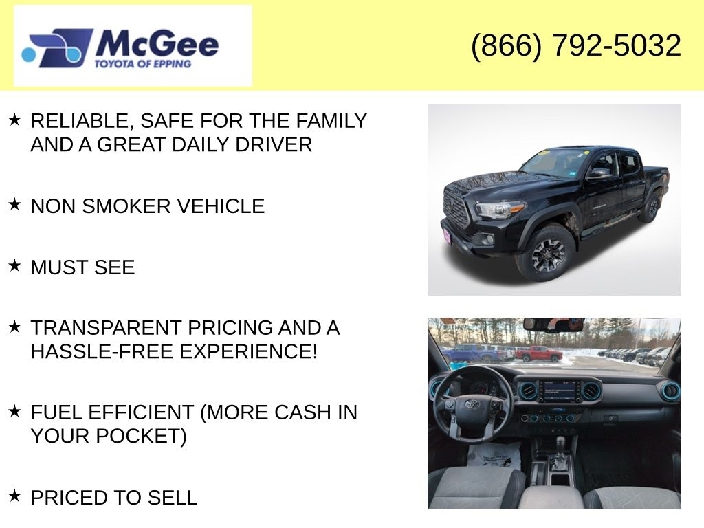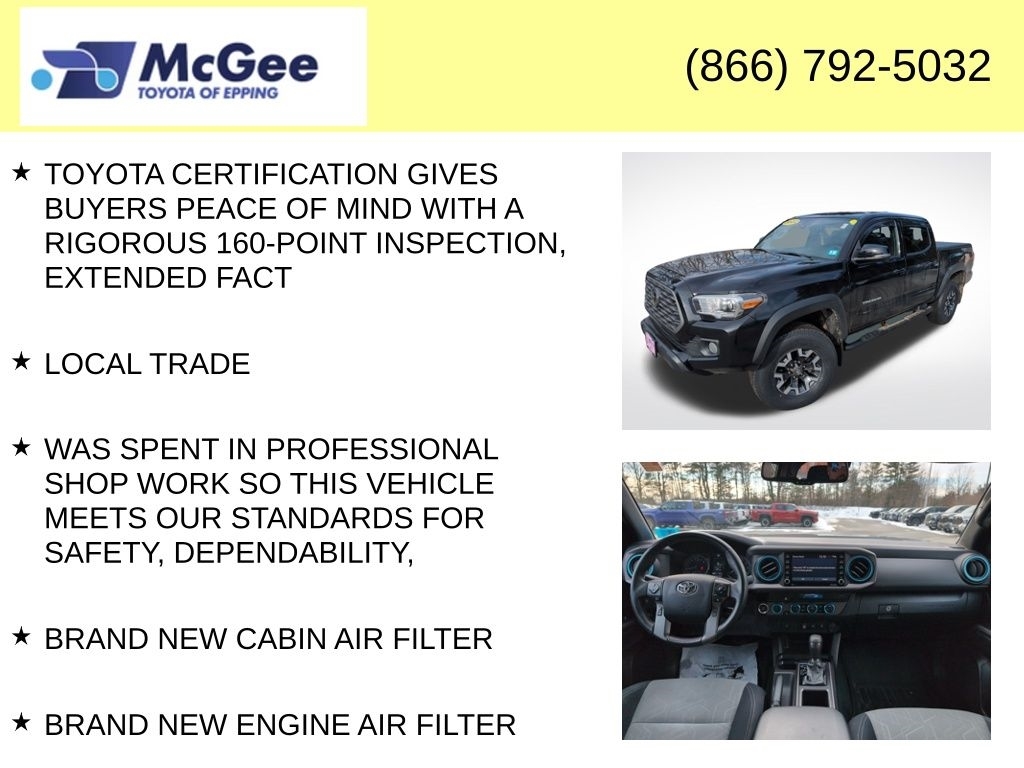 Recent Arrival! RELIABLE, SAFE FOR THE FAMILY AND A GREAT DAILY DRIVER, NON SMOKER VEHICLE, MUST SEE, TRANSPARENT PRICING AND A HASSLE-FREE EXPERIENCE!, FUEL EFFICIENT (MORE CASH IN YOUR POCKET), PRICED TO SELL, LOCAL TRADE, $4,491.13 WAS SPENT IN PROFESSIONAL SHOP WORK SO THIS VEHICLE MEETS OUR STANDARDS FOR SAFETY, DEPENDABILITY,, BRAND NEW CABIN AIR FILTER, BRAND NEW ENGINE AIR FILTER, FRESH ENGINE OIL & FILTER, INSTALLED BOTH FRONT WIPER BLADES, MOUNT & BALANCED 4-NEW TIRES, PERFORMED 4-WHEEL COMPUTERIZED ALIGNMENT, BRAND NEW STEERING RACK, BRAND NEW 12-VOLT VEHICLE BATTERY FOR GUARANTEED STARTING IN COLD WEATHER!, BRAND NEW SPARK PLUGS INSTALLED, PERFORMED TRANSMISSION FLUSH, 4WD, ABS brakes, Alloy wheels, Electronic Stability Control, Front dual zone A/C, Heated door mirrors, Illuminated entry, Low tire pressure warning, Remote keyless entry, Traction control. At McGee Toyota Of Epping we want you to know that all our vehicles are priced at a competitive value position to the market. We use an independent 3rd party software to research internet listings on all vehicles in the market so we can ensure that our prices are the most competitive out there. We do this simply so people choose us when they start searching for their next car. 2022 Toyota Tacoma TRD Off-Road V6 V6 4D Double Cab Midnight Black Metallic 4WD 6-Speed 3.5L V6 PDI DOHC 24V LEV3-ULEV70 278hp Certified. Toyota Silver Certified Details: * SILVER CERTIFIED Eligibility: Vehicles up to 10 Model Years Old & Between 60,000-125,000 Miles on Odometer; Outside Gold Eligibility Parameters, Limited Powertrain Warranty: 12-Month/12,000-Mile(2), 24-Hour Roadside Assistance: 12-Month/12,000-Mile(3), Extended Warranty Coverage (items 2 and 3 above) Transferable at No Cost For Added Resale Value, Quality Assurance Inspection: 136-Point Minimum, Free CARFAX Vehicle History Report, Warranty Honored at Over 1,400 Toyota Dealers in the Continental U.S. and Canada, Trade-Ins Accepted, Trouble-free Handling of Your Transaction; Including DMV Paperwork McGee Toyota is a Family-Owned Business and we enjoy assisting all of our guests buying their next vehicle!