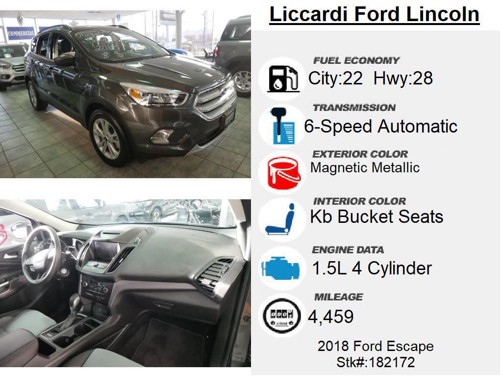 4WD. Odometer is 24063 miles below market average!2018 Ford Escape Magnetic Metallic SE 22/28 City/Highway MPGCARFAX One-Owner. Clean CARFAX. 4WD 6-Speed Automatic EcoBoost 1.5L I4 GTDi DOHC Turbocharged VCTDon't miss your chance to SAVE HUGE $$ on high quality Lincoln Certified Pre-Owned vehicles at Liccardi Lincoln!!Awards: * 2018 KBB.com Brand Image Awards * 2018 KBB.com 10 Most Awarded BrandsWe look forward to earning business!!