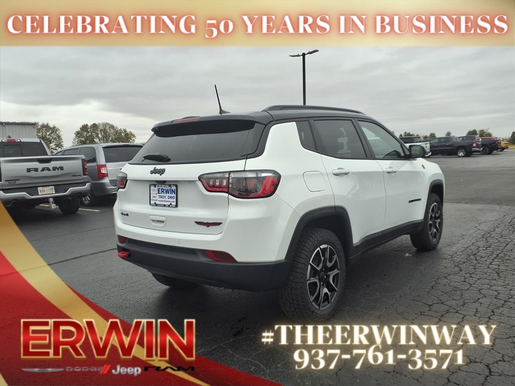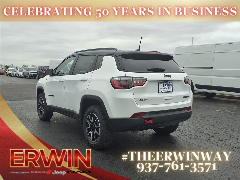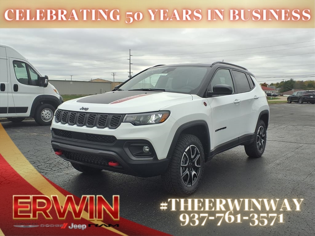 The 2026 Jeep Compass Trailhawk is a state-of-the-art vehicle, with a 2.0 liter 4 cylinder engine, and turbocharged power. It has a bright white exterior and a black interior, and it has been crash tested with a 4 out of 5 stars rating. It also features a number of advanced features such as touch screen display, Bluetooth audio connection, blind spot sensor, hill start assist, part time with on demand four wheel drive, Bluetooth phone connectivity, and leather-trimmed seats. This car is sure to turn heads wherever it goes! Contact Details: Erwin Chrysler Dodge Jeep, 2775 S Co Rd. 25a, Troy, OH, 45373, pat@erwinchrysler.com, 9373355696.