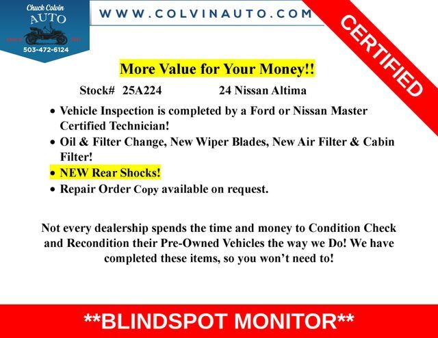 Discover the exceptional 2024 Nissan Altima 2.5 SR, a vehicle that effortlessly combines style, performance, and advanced technology. This stunning silver sedan is a true standout, offering an unparalleled driving experience that will captivate you from the moment you get behind the wheel.Boasting a suite of impressive features, the Altima 2.5 SR is equipped to elevate your daily commute. Highlights include:• COLLISION WARNING SYSTEM• BLINDSPOT MONITOR• APPLE CARPLAY/ ANDROID• BLUETOOTHThe Altima's 2.5L 4-cylinder engine, paired with a smooth-shifting CVT transmission, delivers an exceptional 37 MPG on the highway, ensuring you can go the distance without frequent stops at the pump. With its responsive handling and refined ride quality, this Nissan will make every journey a pleasure.Nissan's commitment to quality is evident in the Altima's Certified status. This vehicle has undergone a rigorous 167-point inspection, ensuring it meets the highest standards of reliability and performance. Backed by a comprehensive warranty and 24/7 roadside assistance, you can drive with confidence, knowing your investment is protected.Beyond its impressive mechanical capabilities, the Altima 2.5 SR boasts a wealth of advanced safety and technology features. The Collision Warning System and Blind Spot Monitor work tirelessly to keep you and your loved ones secure on the road. Apple CarPlay and Android Auto integration allow you to seamlessly connect your smartphone, keeping you entertained and informed throughout your travels.Experience the unparalleled combination of style, performance, and innovation that the 2024 Nissan Altima 2.5 SR has to offer. This exceptional vehicle is priced at $19,900 and is waiting to be discovered. Visit our showroom today and let us demonstrate why the Altima 2.5 SR should be your next automotive investment.Sales Tax, Title, License Fee, Registration Fee, $250 Dealer Document Fee are additional to the listed price and may be added to the sale price or capitalized cost. All vehicles are subject to prior sale. Please contact the Sales Team to confirm the availability and pricing of all vehicles.