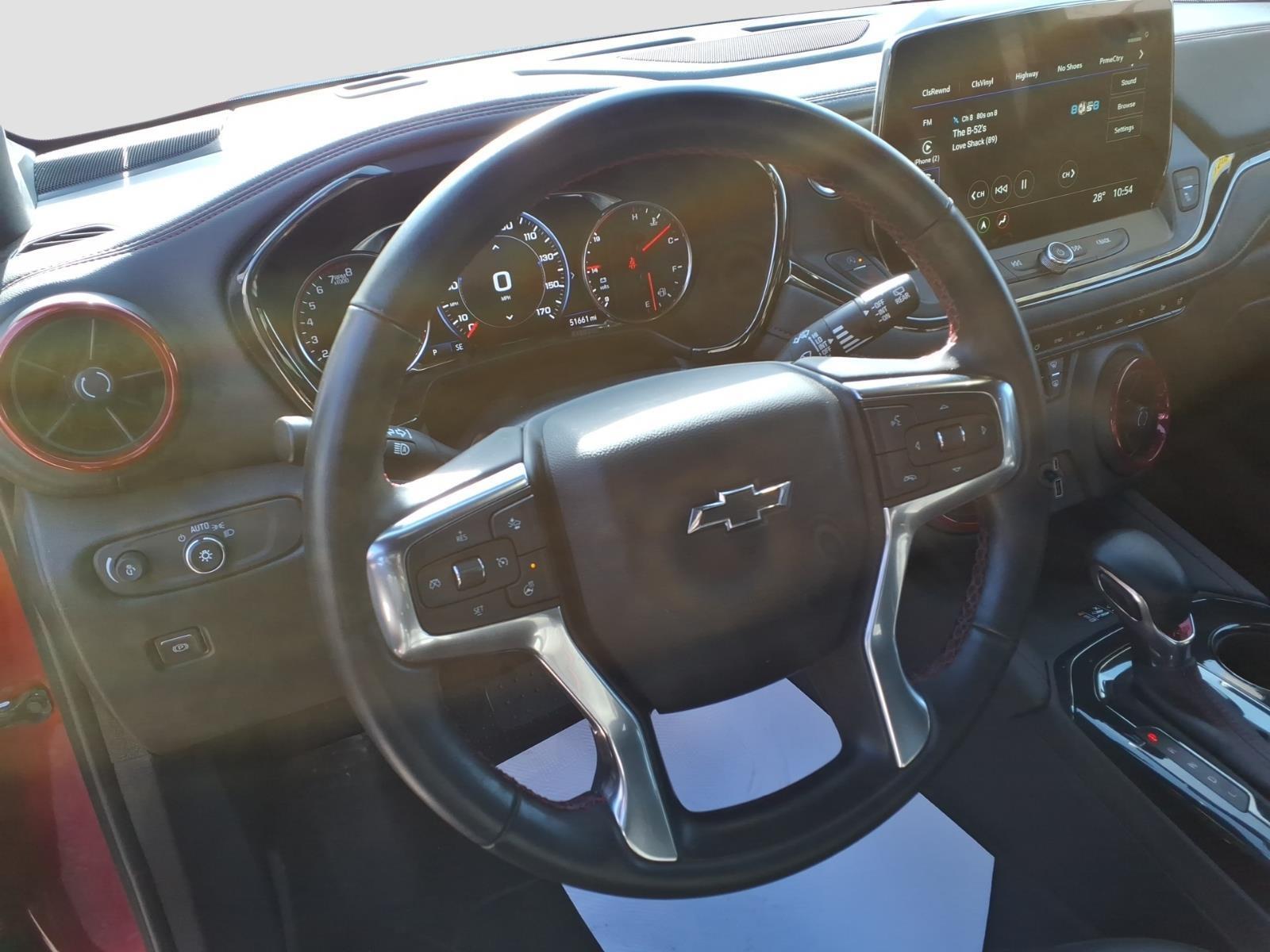 This 2023 Chevrolet Blazer RS is a vehicle that is sure to turn heads. Boasting an all wheel drive system, this motorcar has been meticulously maintained and has driven only 51,661 miles. The car's 3.6 liter 6 cylinder engine is fuel injected and features a radiant red tintcoat exterior with a jet black interior. Safety features include blind spot sensor, hill start assist, part time four wheel drive, navigation system with voice recognition, and touch screen display. This car also has a crash test rating of 5 out of 5 stars, making it an excellent choice for anyone looking for a reliable automobile.