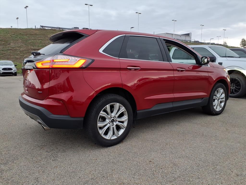 This vehicle is a 2024 Ford Edge Titanium with a 2.0 liter EcoBoost Turbo I4 250hp 275 lb-ft engine, direct injection, and all wheel drive. It has a rapid red metallic tinted clearcoat exterior and a medium soft ceramic interior. It has a crash test rating of 5 out of 5 stars and features such as touch screen display, Bluetooth audio connection, blind spot sensor, hill start assist, on demand four wheel drive, Bluetooth phone connectivity, leather seats. This certified pre-owned car has driven 26,271 miles and has a fuel economy of 21 mpg in the city and 28 mpg on the highway. It also has a crash test rating of 5 out of 5 stars and comes with a carfax report available for review.