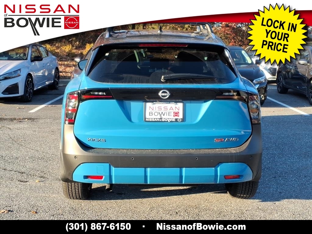 Arctic Ice Blue Metallic/Super Black 2026 Nissan Kicks SR AWD CVT with Xtronic 2.0L DOHC Check out this 2026 Nissan Kicks in Arctic Ice Blue Metallic/Super Black with Sport Cloth, No Money Down / $0 Down. Recent Arrival! 27/34 City/Highway MPG Additional costs include destination, dealer installed options Premium Care, sales tax, tags and dealer processing fee of $799. Additional rebates may apply. Please see dealer for details. Price does include: $500 - Nissan MY26 Kicks SR and SV Customer Cash. Exp. 11/03/2025
