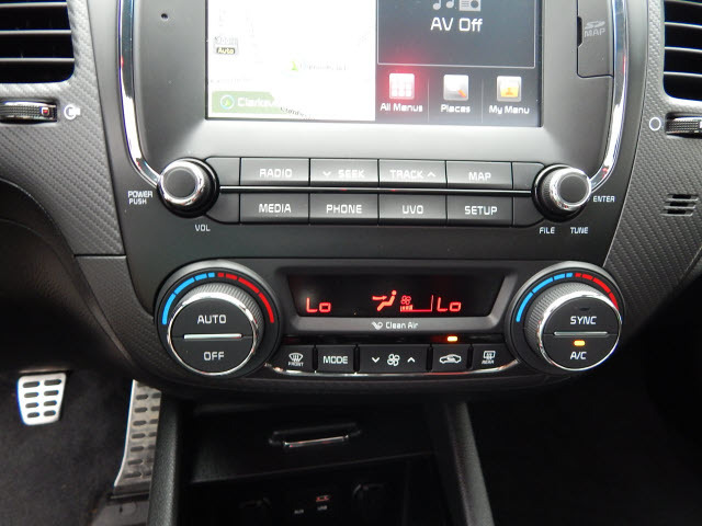 Inside the passenger cabin, the Forte5 features premium materials and soft touch points. Large, easy-to-read white-on-black gauges nestle deeply into the instrument cluster. Chrome accents around the HVAC controls and optional push-button start, along with carbon fiber-like textures on the dash and seats, add a sporty touch. A grippy leather-wrapped steering wheel and shift knob are further evidence of the Forte5's performance aspirations. Class-exclusive available features such as front and rear heated outboard seats, an air-cooled driver’s seat and driver-selectable electric steering further set the Forte5 apart from its competition.
