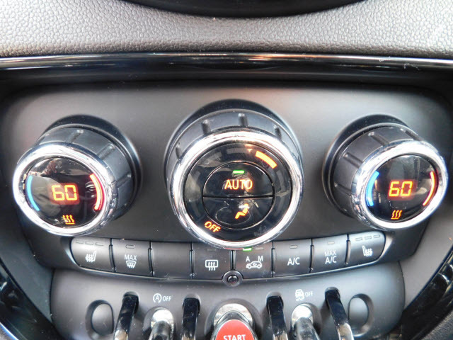 Dual front knee airbags, four-wheel disc brakes with anti-lock, electronic brake force distribution, standby brakes, cornering brake control, automatic self-drying brakes, hill assist, dynamic traction control with electronic differential lock control, dynamic stability control, side-impact door beams, central locking system, engine immobilizer, comfort keyless entry, daytime driving lights, automatic headlights, Bluetooth hands free phone system, and tire pressure monitoring system. Cooper S adds run-flat tires.
