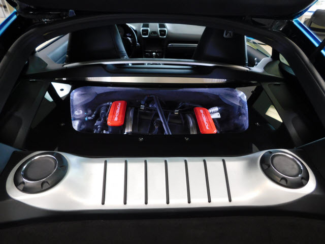 The new Cayman enjoys greater visual differentiation from the Boxster as well as its predecessor. The front of the new Cayman includes prominent air intakes right and left and a round cluster of daytime running lights integrated in the trailing upper edge of each intake. Another distinctive styling element is the large aluminum hatch that extends nearly to the bumper; it meets with a prominent ridge that wraps horizontally into each taillight and integrates a center-mounted LED brake light which spans the entire width of the rear window. Mounted directly to the rear lid is the rear spoiler, a thin blade that is both higher and deploys at a steeper angle than in the Boxster.