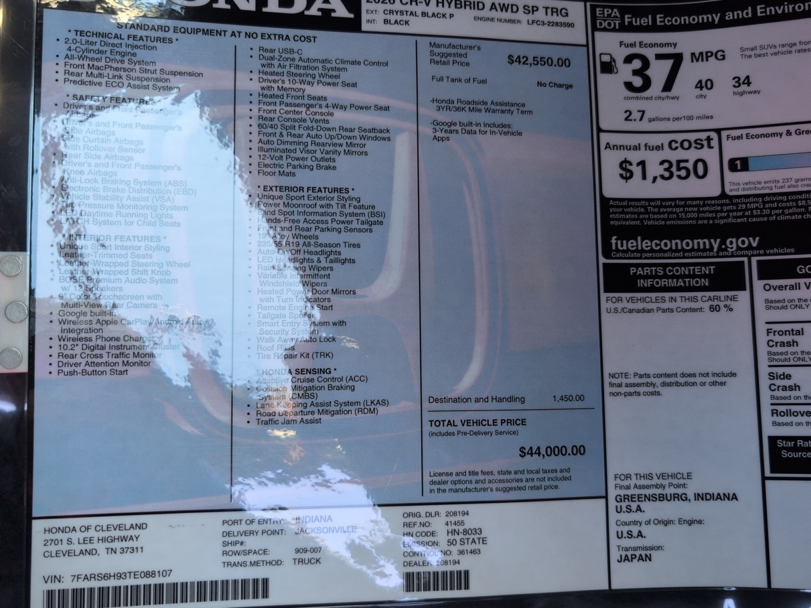 The price you see is our HOC Price. Contact us at (423) 664-9714 to confirm availability and to schedule your test drive. Crystal Black Pearl 2026 Honda CR-V Hybrid Sport Touring AWD eCVT 2.0L I4 DOHC 16V.Recent Arrival! 40/34 City/Highway MPG
