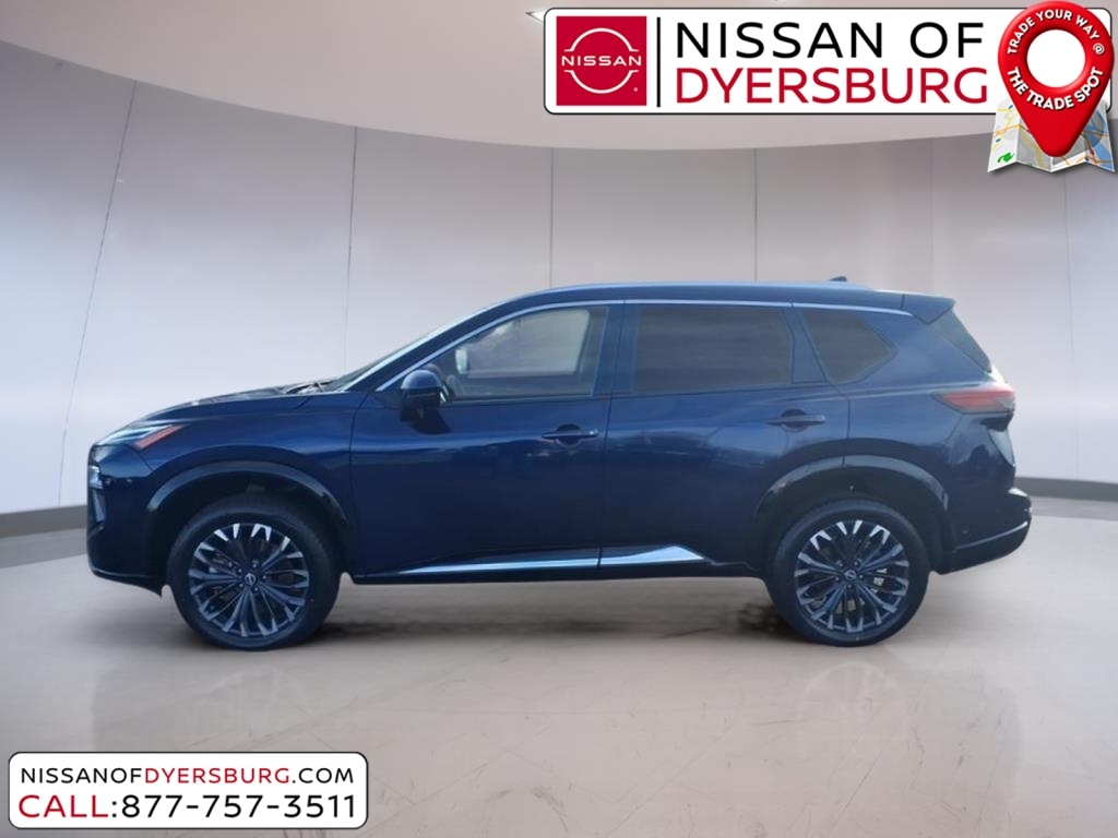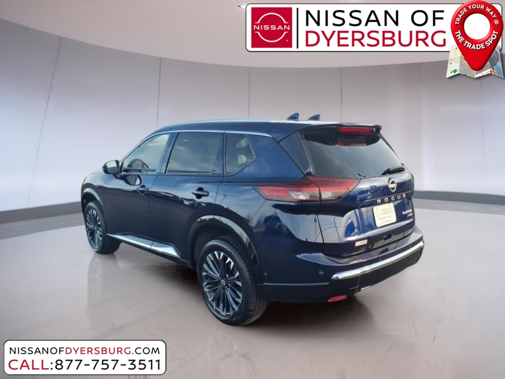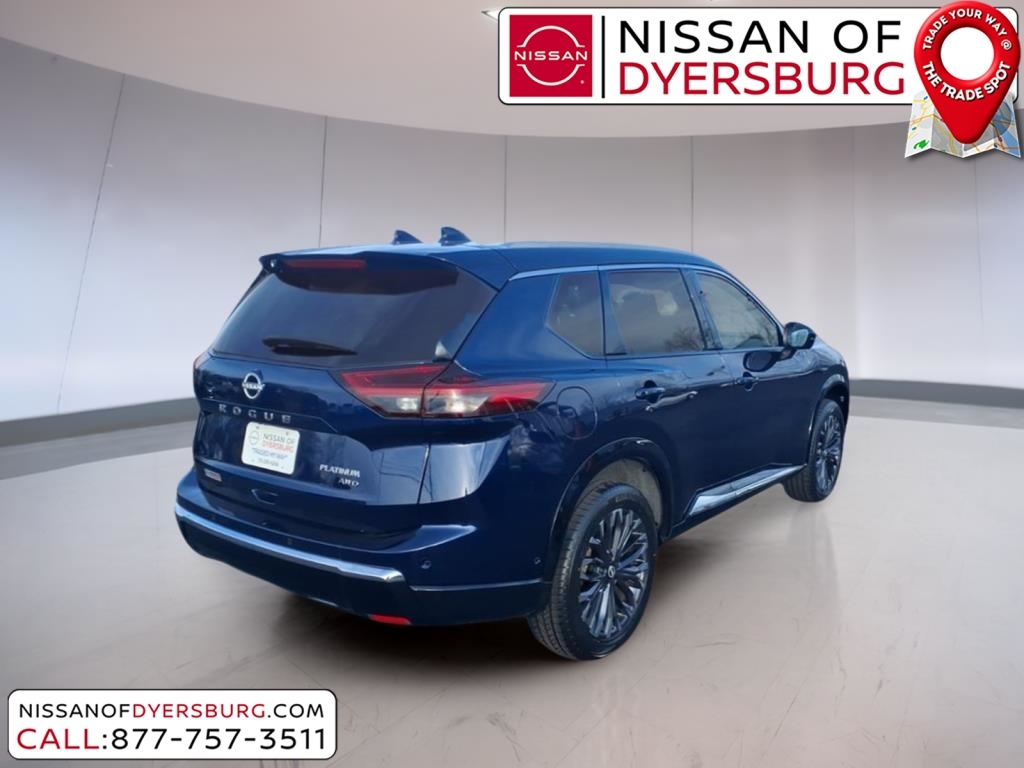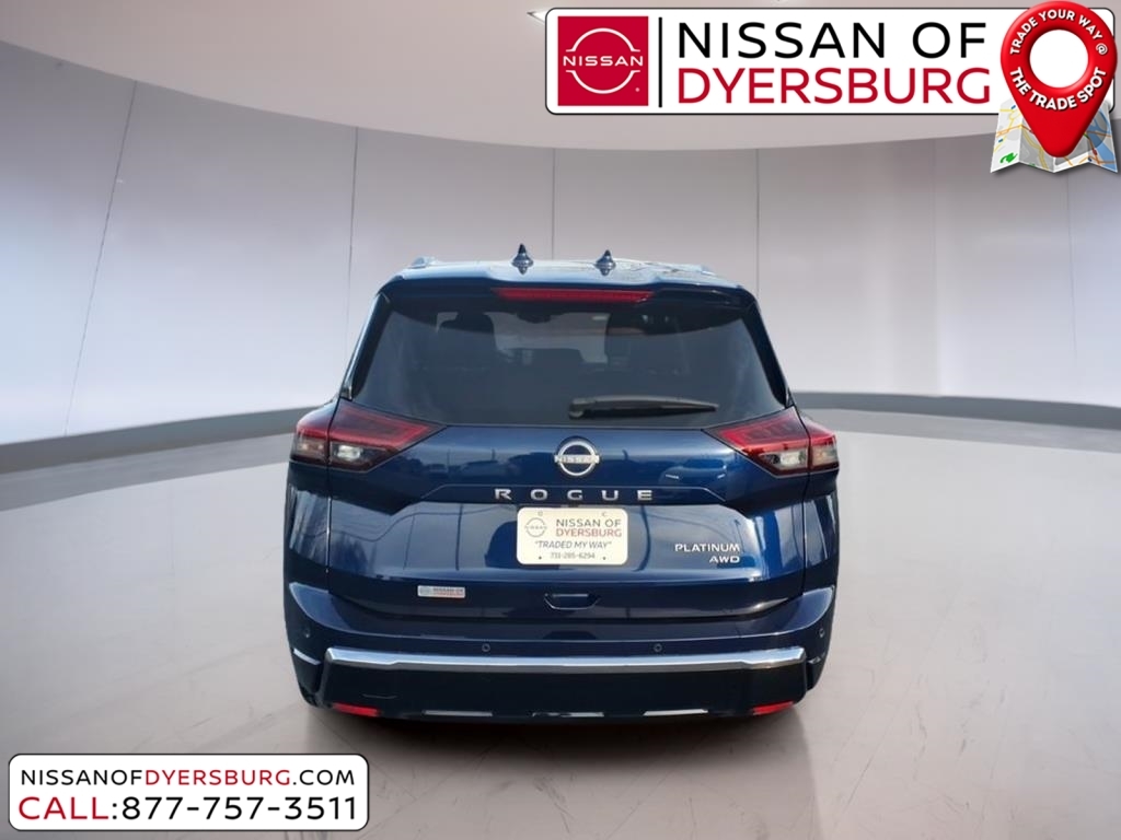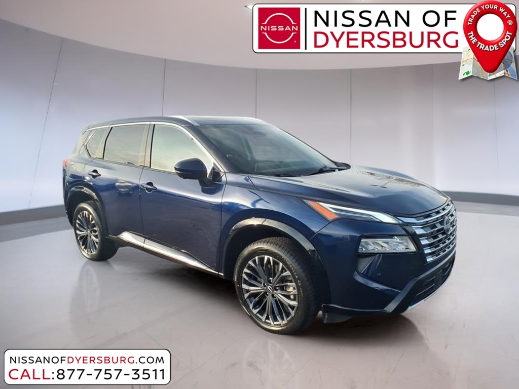 At Nissan of Dyersburg, we're more than just your local dealership - we're your neighbors. Whether you're looking for a new Nissan or a dependable pre-owned vehicle, we've got the perfect fit for your family and budget. Our goal is simple: to make your car-buying experience easy, friendly, and memorable. Come see us today, and let us show you why we love to see you happy! CARFAX One-Owner. Clean CARFAX. 2025 Nissan Rogue Platinum Deep Ocean Blue Pearl AWD 1.5L DOHC AWD, AM/FM radio: SiriusXM with 360L, Android Auto and Apple CarPlay, Auto High-beam Headlights, Front dual zone A/C, Heated front seats, Heated Rear Seats, Heated steering wheel, Motion-Activated Power Liftgate, Navigation system: NissanConnect with Navigation and Services, Power Liftgate, Power moonroof, Quilted and Perforated Semi-Aniline Leather-Appointed Seat Trim, Remote keyless entry, 10 Speakers, 3D Enhanced Intelligent Around View Monitor with Front Wide View & Invisible Hood View, 4-Wheel Disc Brakes, ABS brakes, Air Conditioning, Alloy wheels, Auto-dimming Rear-View mirror, Automatic temperature control, Brake assist, Bumpers: body-color, Delay-off headlights, Driver Attention Warning with Driver Distraction Warning, Driver door bin, Driver vanity mirror, Dual front impact airbags, Dual front side impact airbags, Electronic Stability Control, Emergency communication system: NissanConnect Services, First Aid Kit, Floor Mats with 2-Piece Cargo Area Protector, Four wheel independent suspension, Front anti-roll bar, Front Bucket Seats, Front Center Armrest, Front reading lights, Fully automatic headlights, Garage door transmitter: myQ Connected Garage, Head-Up Display, Heated door mirrors, Heated Front Bucket Seats with 8-Way Power Driver Seat and 4-Way Power Passenger Seat, Illuminated entry, Knee airbag, Low tire pressure warning, Memory seat, Occupant sensing airbag, Outside temperature display, Overhead airbag, Overhead console, Panic alarm, Passenger door bin, Passenger vanity mirror, Platinum Premium Package, Power door mirrors, Power driver seat, Power passenger seat, Power steering, Power windows, ProPILOT Assist 2.1 with Driver Monitor, Radio data system, Radio: NissanConnect with Navigation and 10 Speaker BOSE Premium Audio System, Rain-Sensing Wipers, Rear anti-roll bar, Rear Door Sunshades, Rear reading lights, Rear seat center armrest, Rear side impact airbag, Rear window defroster, Rear window wiper, Security system, Speed control, Speed-sensing steering, Speed-Sensitive Wip