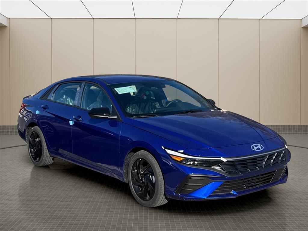 INFORMATION ABOUT THIS VEHICLE AND IT FEATURES:. Option Group 01, 4-Wheel Disc Brakes, 6 Speakers, ABS brakes, Air Conditioning, Alloy wheels, AM/FM radio, Apple CarPlay & Android Auto, Auto High-beam Headlights, Automatic temperature control, Brake assist, Bumpers: body-color, Cargo Net, Cargo Tray, Carpeted Floor Mats, Center Console Tray, Delay-off headlights, Door Sill Plates, Driver door bin, Driver vanity mirror, Dual front impact airbags, Dual front side impact airbags, Electronic Stability Control, Exterior Parking Camera Rear, First Aid Kit, Front anti-roll bar, Front Bucket Seats, Front Center Armrest, Front dual zone A/C, Front reading lights, Front wheel independent suspension, Fully automatic headlights, Illuminated entry, Low tire pressure warning, Occupant sensing airbag, Outside temperature display, Overhead airbag, Overhead console, Panic alarm, Passenger door bin, Passenger vanity mirror, Power door mirrors, Power steering, Power windows, Premium Cloth Seat Trim, Radio: AM/FM/HD Display Audio, Rear side impact airbag, Rear window defroster, Remote keyless entry, Security system, Speed control, Speed-sensing steering, Spoiler, Steering wheel mounted audio controls, Tachometer, Telescoping steering wheel, Tilt steering wheel, Traction control, Trip computer, Variably intermittent wipers, and Wheels: 17x 7.0J Alloy Gloss Black w/Dark Finish. Intense Blue 2026 Hyundai Elantra SEL Sport FWD CVT I4 30/39 City/Highway MPG