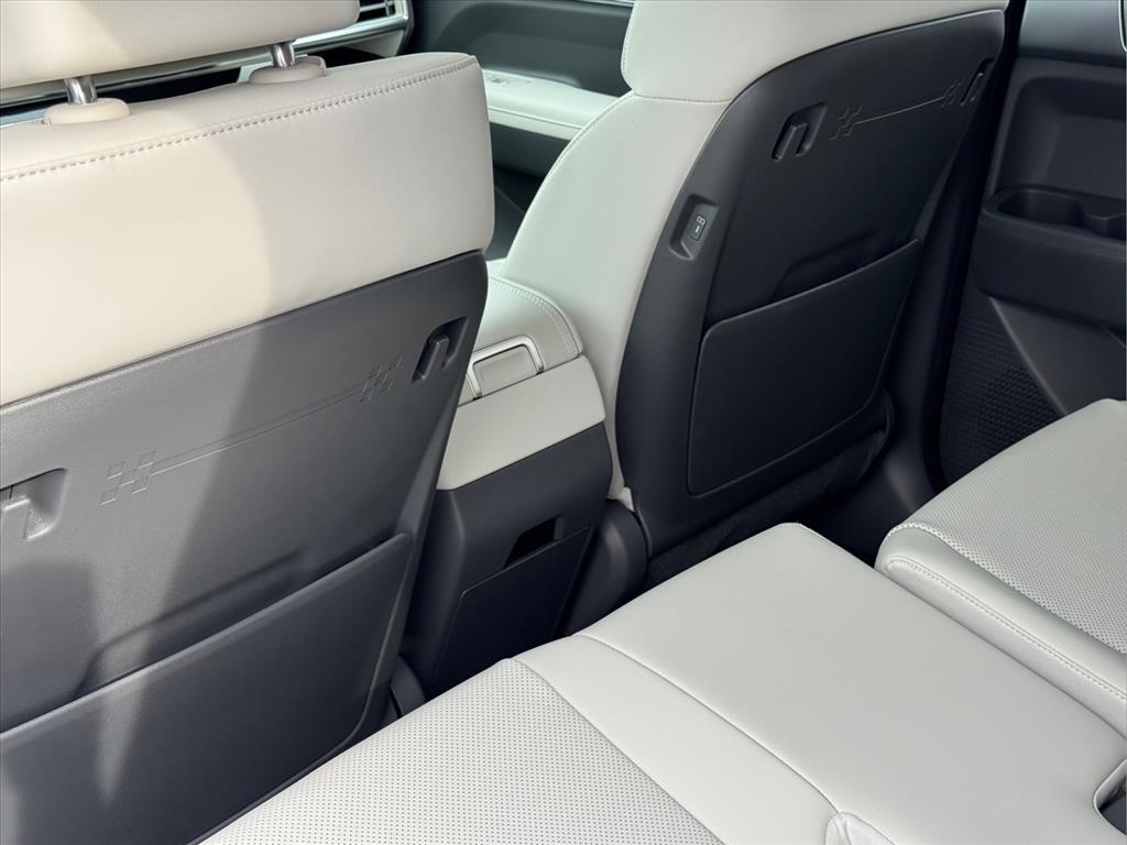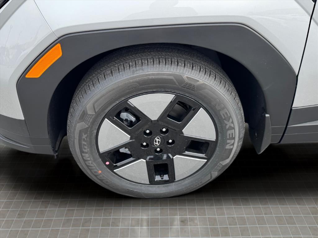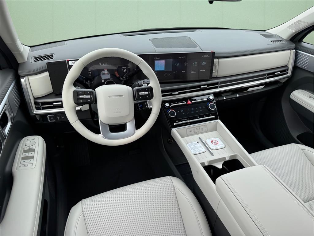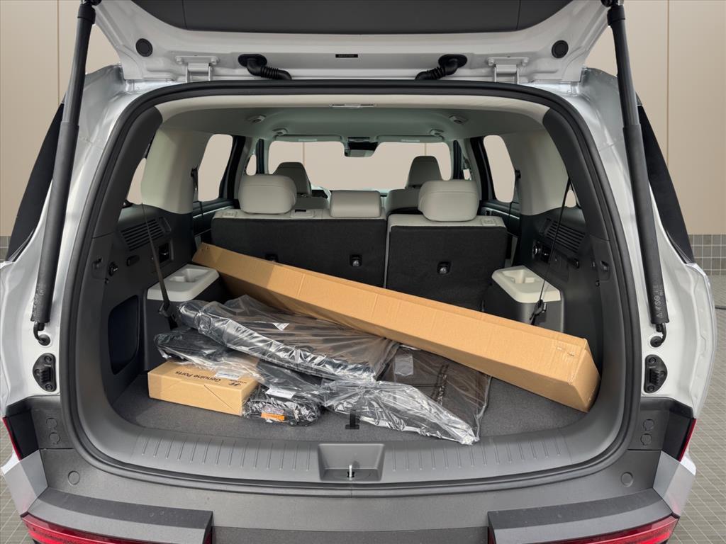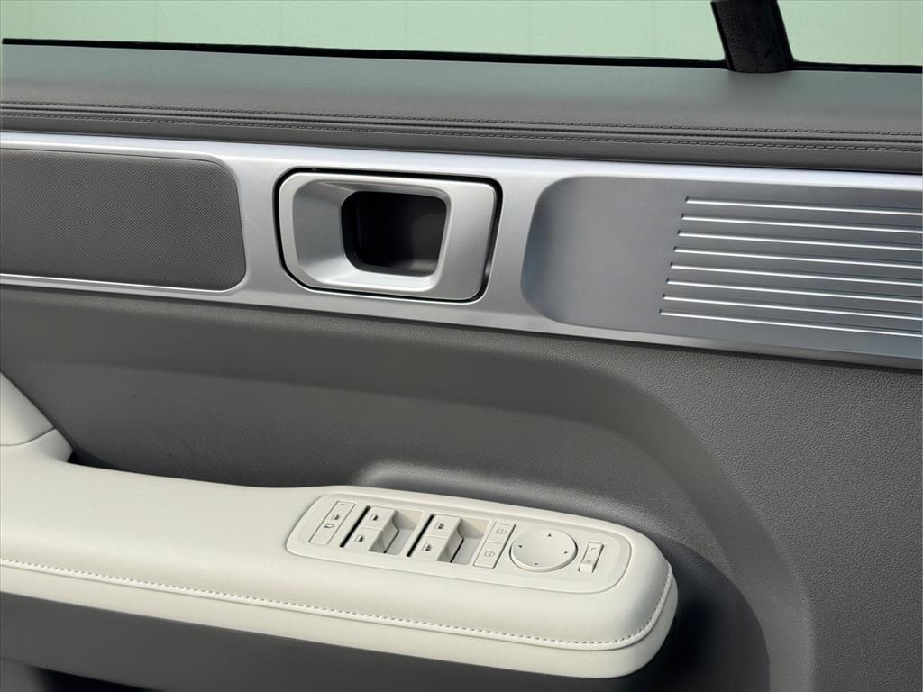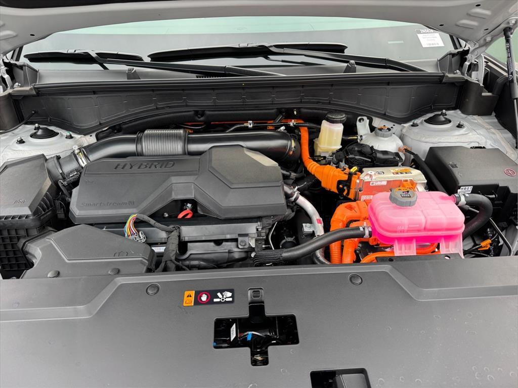 INFORMATION ABOUT THIS VEHICLE AND IT FEATURES:, I4. Option Group 01, I4, 18x 7.5J Alloy Wheels, 3rd row seats: bench, 4-Wheel Disc Brakes, 6 Speakers, ABS brakes, Air Conditioning, Alloy wheels, AM/FM radio: SiriusXM, Apple CarPlay & Android Auto, Auto High-beam Headlights, Automatic temperature control, Brake assist, Bumpers: body-color, Cargo Cover/Screen, Cargo Net, Cargo Tray, Carpeted Floor Mats, Delay-off headlights, Driver door bin, Driver vanity mirror, Dual front impact airbags, Dual front side impact airbags, Electronic Stability Control, Emergency communication system, Exterior Parking Camera Rear, First Aid Kit, Four wheel independent suspension, Front anti-roll bar, Front Bucket Seats, Front Center Armrest, Front dual zone A/C, Front reading lights, Fully automatic headlights, H-Tex Leatherette Seat Trim, Heated door mirrors, Heated Front Bucket Seats, Heated front seats, Illuminated entry, Knee airbag, Leather steering wheel, Low tire pressure warning, Mudguards, Occupant sensing airbag, Outside temperature display, Overhead airbag, Overhead console, Panic alarm, Passenger door bin, Passenger vanity mirror, Power door mirrors, Power driver seat, Power Liftgate, Power steering, Power windows, Radio: AM/FM/HD Display Audio, Rear anti-roll bar, Rear seat center armrest, Rear side impact airbag, Rear window defroster, Rear window wiper, Remote keyless entry, Security system, Speed control, Speed-sensing steering, Split folding rear seat, Spoiler, Steering wheel mounted audio controls, Tachometer, Telescoping steering wheel, Tilt steering wheel, Traction control, Trip computer, Turn signal indicator mirrors, and Variably intermittent wipers. Shimmering Silver 2026 Hyundai Santa Fe Hybrid SEL FWD 6-Speed Automatic with Shiftronic I4