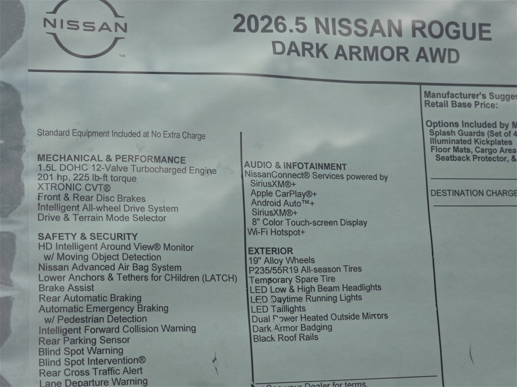 Recent Arrival! Gun Metallic 2026 Nissan Rogue Dark Armor 1.5L DOHC AWD 4D Sport Utility CVT with Xtronic 4D Sport Utility, 1.5L DOHC, CVT with Xtronic, AWD, Gun Metallic, Charcoal Artificial Leather, ABS brakes, Active Cruise Control, Alloy wheels, Electronic Stability Control, Front dual zone A/C, Heated door mirrors, Heated Front Bucket Seats, Heated front seats, Illuminated entry, Low tire pressure warning, Power Liftgate, Power moonroof, Remote keyless entry, Traction control, 4-Wheel Disc Brakes, 6 Speakers, Air Conditioning, AM/FM radio, Apple CarPlay/Android Auto, Auto High-beam Headlights, Automatic temperature control, Brake assist, Bumpers: body-color, Delay-off headlights, Driver door bin, Driver vanity mirror, Dual front impact airbags, Dual front side impact airbags, Emergency communication system: NissanConnect Services, Exterior Parking Camera Rear, Four wheel independent suspension, Front anti-roll bar, Front Bucket Seats, Front Center Armrest, Front reading lights, Fully automatic headlights, Heated steering wheel, Knee airbag, Occupant sensing airbag, Outside temperature display, Overhead airbag, Overhead console, Panic alarm, Passenger door bin, Passenger vanity mirror, Power door mirrors, Power driver seat, Power steering, Power windows, Prima-Tex Leatherette Seat Trim, Radio data system, Radio: AM/FM NissanConnect, Rear anti-roll bar, Rear Parking Sensors, Rear reading lights, Rear seat center armrest, Rear side impact airbag, Rear window defroster, Rear window wiper, Speed control, Speed-sensing steering, Speed-Sensitive Wipers, Split folding rear seat, Spoiler, Steering wheel mounted audio controls, Tachometer, Telescoping steering wheel, Tilt steering wheel, Trip computer, Variably intermittent wipers, Wheels: 19Black Painted and Machine Finished Alloy, 4D Sport Utility, 1.5L DOHC, CVT with Xtronic, AWD, Gun Metallic, Charcoal Artificial Leather, ABS brakes, Active Cruise Control, Alloy wheels, Electronic Stability Control, Front dual zone A/C, Heated door mirrors, Heated Front Bucket Seats, Heated front seats, Illuminated entry, Low tire pressure warning, Power Liftgate, Power moonroof, Remote keyless entry, Traction control. Discover the latest in automotive innovation at Mtn View Nissan, a premier destination for new Nissans and a proud member of the esteemed Mtn View Auto Group with locations in Chattanooga, Cleveland, and Dalton, GA. Explore our showroom to find the perfect new Nissan for you, backed by our commitment to exc
