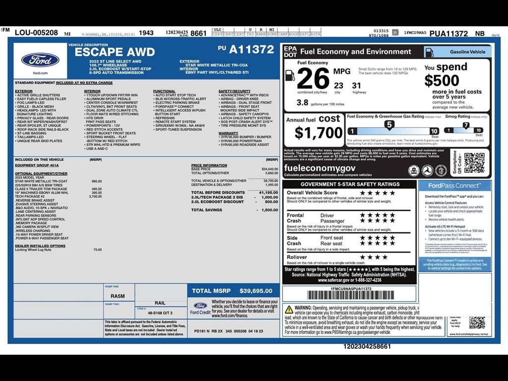 SUMMARY Clean Carfax!**WARRANTY REMAINING: 7 MONTHS OR 16,683 MILES****TECH PACKAGE #2** ($3,700 ADD TO MSRP), STAR WHITE METALLIC TRI-COAT, CLASS II TRAILER TOW PACKAGE, 19 MACHINED EBONY ALUM WHEEL, EQUIPMENT GROUP 401A, 2.0L, 8-SPEED AUTO TRANSMISSION, AWD, KEYLESS ENTRY, PUSH BUTTON START, REMOTE START, HEATED STEERING WHEEL, SPORT BUCKET FRONT SEATS, HEATED & COOLED FRONT SEATS, POWER DRIVER AND PASSENGER SEAT, 360 DEGREE CAMERA, FORDPASS CONNECT, SIRIUSXM, B&O AUDIO, ADAPTIVE CRUISE CONTROL, WIRELESS CHARGING PAD, LED HEADLAMPS, LED FOG LAMPS, LED TAILLAMPS, BLIS W/CROSS-TRAFFIC ALERT, SOS POST-CRASH ALERT SYSTEM, LANE CENTERING ASSIST EQUIPMENT Safety and Security The vehicle is equipped with a system that senses, and then prepares, the vehicle and/or occupants, for an impending forward collision. The vehicle constantly monitors the roadway in front of the vehicle and identifies and tracks pedestrians on an interior display. If the system determines a likely impact, it will automatically take preventative steps to avoid hitting the pedestrian. With this system the drivers hands must remain on the wheel at all times but can be removed briefly (for a few seconds), otherwise the vehicle will prompt the driver to put their hands back on the wheel.Technology and Telematics SYNC 4 AppLink/Apple CarPlay/Android Auto smart device wireless mirroring Mobile devices can wirelessly connect to the internet through the vehicles private mobile network. PACKAGES Tech Pack #2 ($3,700 value)10-Way Power Driver Seat12.3 Productivity Screen in Instrument Cluster360-Degree Camera with Split View6-Way Power Passenger SeatSecuriCode Keyless Entry KeypadHD RadioMemory PackageB&O Sound System by Bang and OlufsenWireless Charging PadFord Co-Pilot360 Assist 2.0Body Color MirrorsSYNC 4 with Enhanced Voice RecognitionEquipment Group 401A8-Speed Automatic Transmission2.0L EcoBoost EngineHeated Vinyl/cloth Front Sport Contour Bucket SeatsTBD GVWR