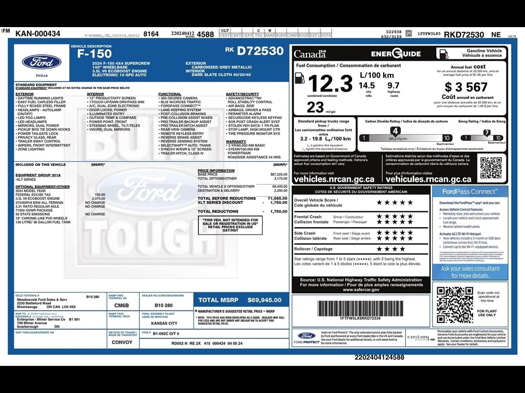 SUMMARY Clean Carfax!**3.5L V6 ECOBOOST ENGINE** ($2,075 ADD TO MSRP), EQUIPMENT GROUP 301A, 3.5L V6, ELECTRONIC 10-SPD AUTO, 4WD, ALL-TERRAIN TIRES, 36 GALLON FUEL TANK, KEYLESS ENTRY, PUSH BUTTON START, REMOTE START, 12 IN SCREEN DISPLAY, SYNCr4, 360-DEGREE CAMERA, FORDPASS CONNECTT, REAR VIEW CAMERA, LED HEADLAMPS, LED FOG LAMPS, POWER TAILGATE LOCK, PICKUP BOX TIE DOWN HOOKS, TRAILER SWAY CONTROL, BLIS W/CROSS TRAFFIC, LANE-KEEPING SYSTEM, PRE-COLLISION ASSIST W/AEB, PRO TRAILER BACKUP ASSIST, PRO TRAILER HITCH ASSIST, TRAILER HITCH, CLASS IV, SOS POST CRASH ALERT SYSTEM, SECURICODE KEYLESS KEYPAD EQUIPMENT Safety and Security The vehicle is equipped with a system that senses, and then prepares, the vehicle and/or occupants, for an impending forward collision. The vehicle constantly monitors the roadway in front of the vehicle and identifies and tracks pedestrians on an interior display. If the system determines a likely impact, it will automatically take preventative steps to avoid hitting the pedestrian. The vehicle is equipped with a camera that displays an image of the area behind the vehicle on an interior display.Technology and Telematics SYNC 4 AppLink/Apple CarPlay/Android Auto smart device wireless mirroring Mobile devices can wirelessly connect to the internet through the vehicles private mobile network. PACKAGES
