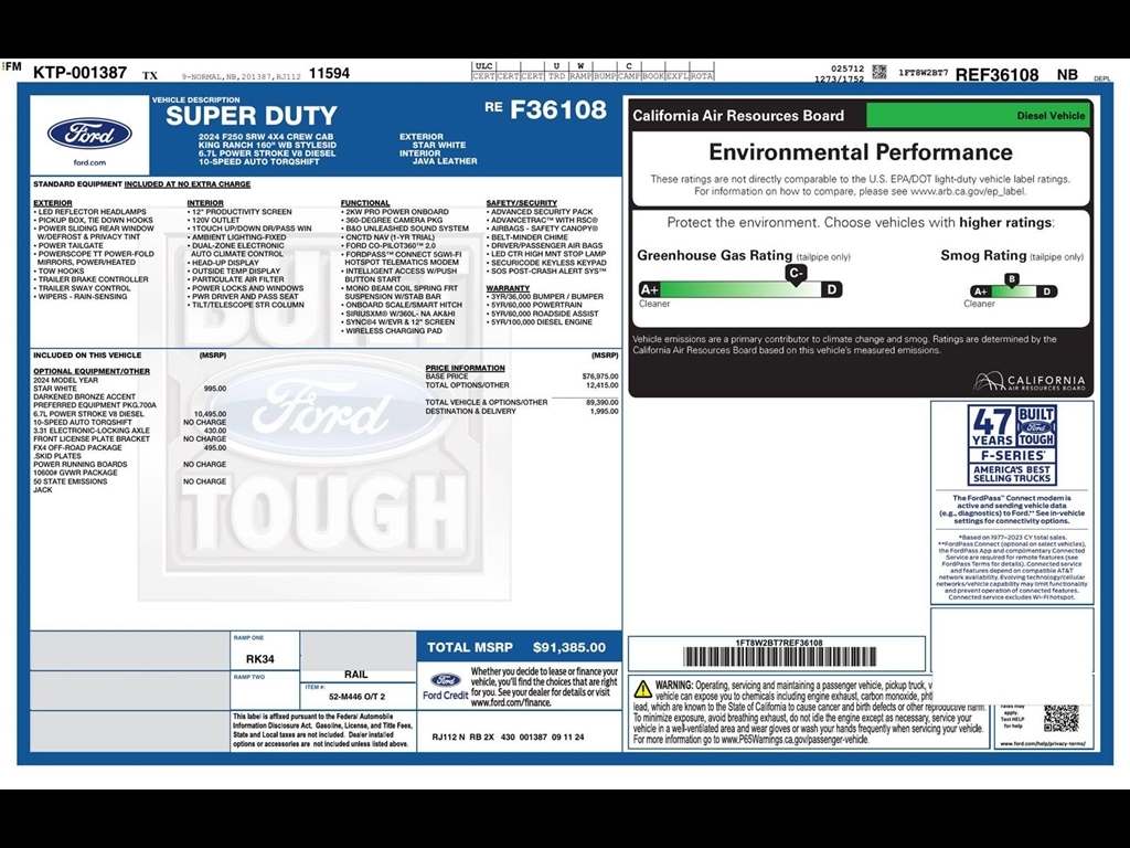 SUMMARY Clean Carfax! One Owner! **WARRANTY REMAINING: 25 MONTHS OR 10,486 MILES**, **6.7L POWER STROKE V8 DIESEL** ($10,495 ADD TO MSRP), PREFERRED EQUIPMENT PKG.700A, FX4 OFF-ROAD PACKAGE, 360-DEGREE CAMERA PKG, 6.7L V8, 10-SPEED AUTO TORQSHIFT, 4WD, KEYLESS ENTRY, PUSH BUTTON START, REMOTE START, POWER DRIVERS SEAT, POWER PASSENGER SEAT, SYNC 4, 12 IN SCREEN DISPLAY, B&O UNLEASHED SOUND SYSTEM, FORD CO-PILOT360T 2.0, FORDPASST CONNECT 5GWI-FI, HOTSPOT TELEMATICS MODEM, NAVIGATION, WIRELESS CHARGING PAD, LED HEADLAMPS, POWER RUNNING BOARDS, POWER TAILGATE, TOW HOOKS, SOS POST-CRASH ALERT SYSTEM EQUIPMENT Safety and Security With this system the drivers hands must remain on the wheel at all times but can be removed briefly (for a few seconds), otherwise the vehicle will prompt the driver to put their hands back on the wheel. The vehicle is equipped with a camera that displays an image of the area behind the vehicle on an interior display. An active lane departure system alerts the driver of unintended movement of the vehicle out of a designated traffic lane and automatically maintains the vehicles position within that lane. The vehicle is equipped with a system that senses, and then prepares, the vehicle and/or occupants, for an impending rear collision.Technology and Telematics Mobile devices can wirelessly connect to the internet through the vehicles private mobile network. PACKAGES FX4 Off-Road Package ($495 value)Unique FX4 Off-Road Box DecalHill Descent ControlOff-Road Specifically Tuned Shock AbsorbersTransfer Case and Fuel Tank Skid PlatesOrder Code 700A