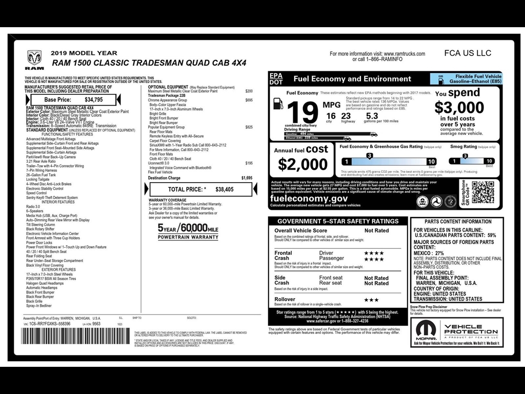SUMMARY Clean Carfax! One Owner! TRADESMAN PACKAGE 22B, CHROME APPEARANCE GROUP, POPULAR EQUIPMENT GROUP, 3.6-LITER V6, 8-SPEED AUTOMATIC 845RE TRANSMISSION, 4WD, KEYLESS ENTRY, PUSH BUTTON START, REMOTE START, UCONNECTr 3, REAR VIEW CAMERA, CRUISE CONTROL, BEDLINER, THEFT DETERRENT SYSTEM EQUIPMENT Comfort The seating surfaces are covered in vinyl. The seating surfaces are covered in cloth. Driver seat with 4-way directional controls Front passenger seat with 4-way directional controlsConvenience The keyfob has a dedicated button for unlocking the cargo area trunk/hatch/door. PACKAGES Chrome Appearance Group with Low Volume Paints ($695 value)Bright Rear BumperBody Color Upper FasciaBright Front BumperBright Grille17 X 7 Aluminum WheelsChrome Plus Package with Low Volume PaintsQuick Order Package 22B TradesmanTradesman PackagePopular Equipment Group ($825 value)Front Floor MatsRear Floor MatsRemote Keyless Entry with All-SecureSiriusXM Satellite RadioCloth 40/20/40 Bench Seat
