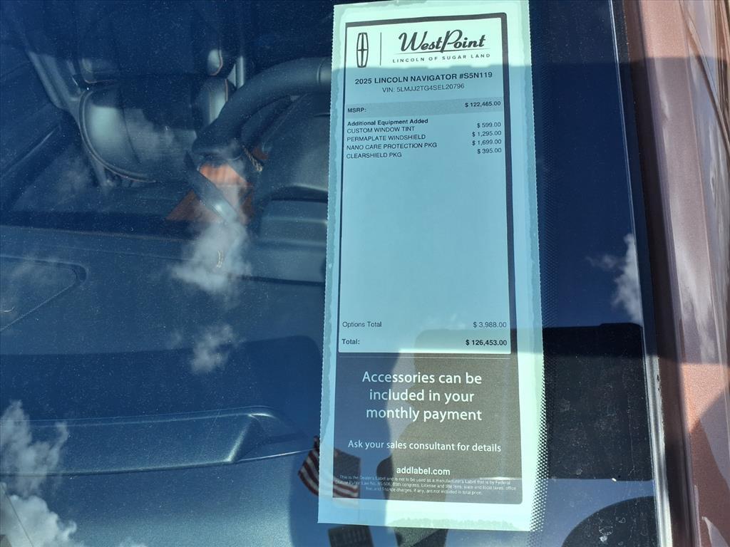 Price includes: $3000 - Retail Customer Cash. Exp. 03/31/2026 Price includes $9,988 of dealer added accessories. Dealer Installed Options:Custom Window TintNano Protection Permaplate Protection Clearshield Protection Custom 24 Wheels & Tires West Point Lincoln Sugar Land is proud to offer this gorgeous-looking 2025 Lincoln Navigator Black Label in Copper Metallic with Blk Onyx W/Brandy Stitch interior. Well equipped with Equipment Group 800A Black Label, 28 Speakers, 3rd row seats: split-bench, 4-Wheel Disc Brakes, A/V remote, ABS brakes, Adaptive suspension, Adjustable pedals, Air Conditioning, All-Weather Flr Liners w/Fr & Rr Carpet Floor Mats, Alloy wheels, AM/FM radio: SiriusXM with 360L, Apple CarPlay/Android Auto, Audio memory, Auto High-beam Headlights, Auto Htd & Ventilated Opulence Lthr Capt Chair, Auto Start-Stop Technology, Auto tilt-away steering wheel, Auto-dimming door mirrors, Auto-dimming Rear-View mirror, Auto-leveling suspension, Automatic temperature control, Brake assist, Bumpers: body-color, Cargo Area Protector w/3rd Row Seat Back, Compass, Delay-off headlights, Driver door bin, Driver vanity mirror, Driver's Seat Mounted Armrest, Dual front impact airbags, Dual front side impact airbags, Electronic Stability Control, Emergency communication system: 911 Assist, Enlighten Theme, Exterior Parking Camera Rear, First Aid Kit w/Lincoln Logo, Four wheel independent suspension, Front anti-roll bar, Front Bucket Seats, Front dual zone A/C, Front License Plate Bracket, Front reading lights, Fully automatic headlights, Garage door transmitter, Head restraints memory, Headphones, Heated door mirrors, Heated front seats, Heated rear seats, Heated steering wheel, HVAC memory, Illuminated entry, Leather steering wheel, Lincoln Connect, Lincoln Premium Connectivity, Low tire pressure warning, Memory seat, Navigation system: Connected Navigation (1-year trial), Occupant sensing airbag, Outside temperature display, Overhead airbag, Overhead console, Panic alarm, Passenger door bin, Passenger seat mounted armrest, Passenger vanity mirror, Pedal memory, Power adjustable front head restraints, Power adjustable rear head restraints, Power door mirrors, Power driver seat, Power moonroof: Panoramic Vista Roof, Power passenger seat, Power steering, Power windows, Radio data system, Radio: Revel Ultima 3D AM/FM/HD Audio System, Rain sensing wipers, Rear air conditioning, Rear anti-roll bar, Rear audio controls, Rear reading lights