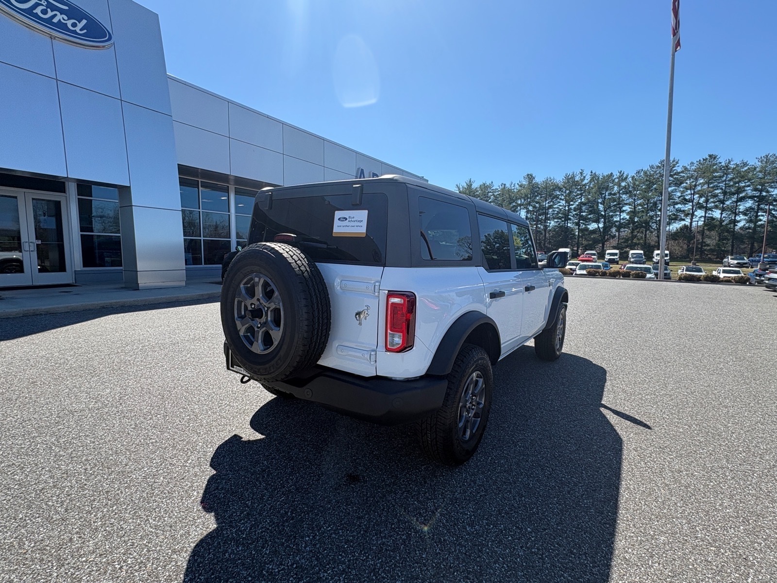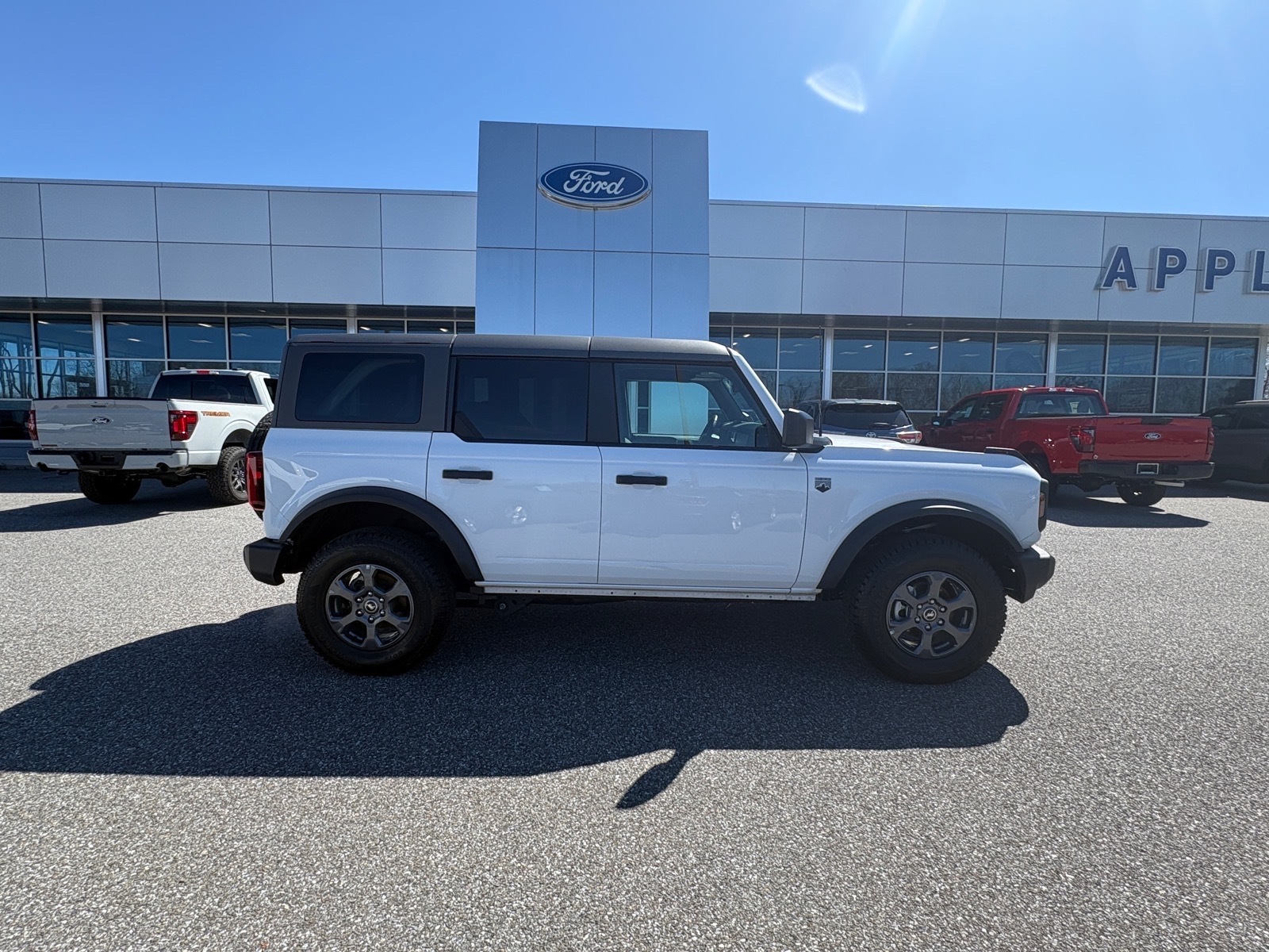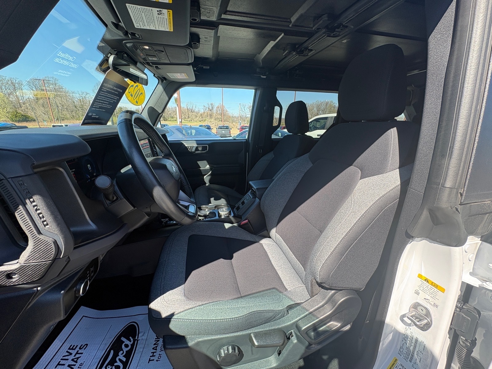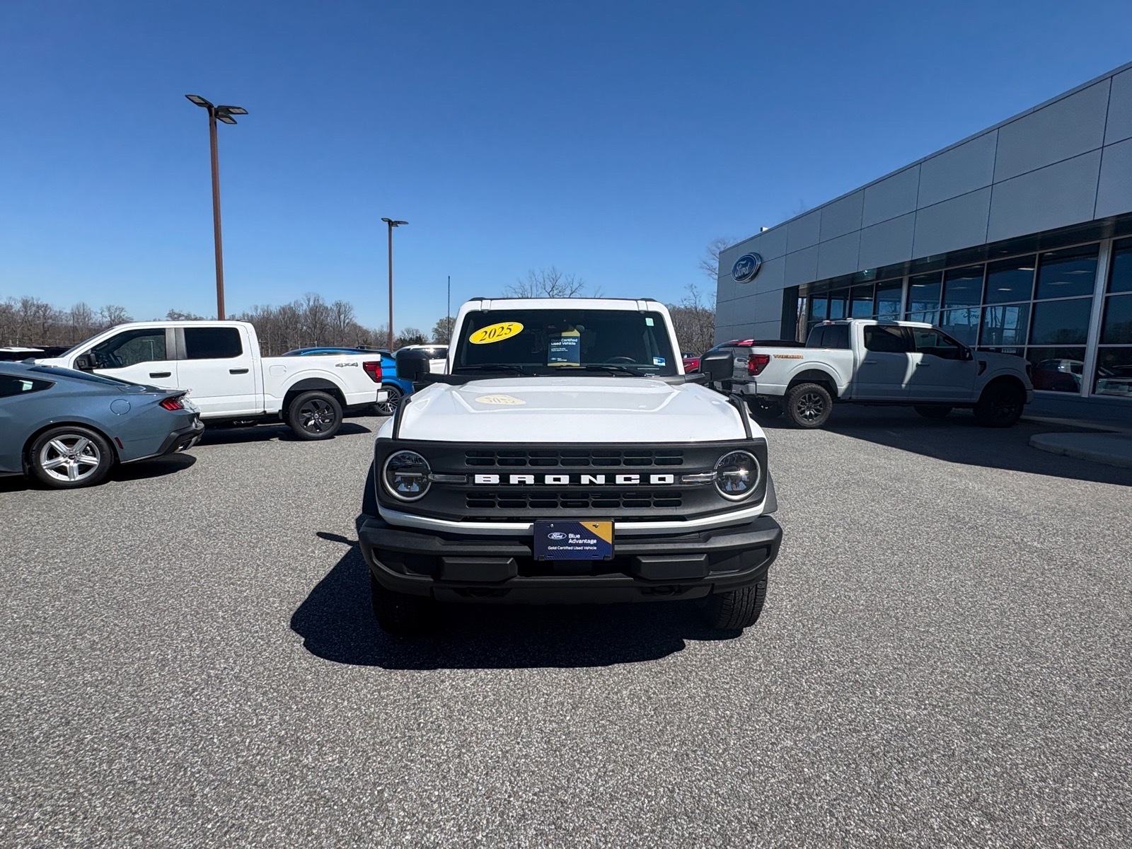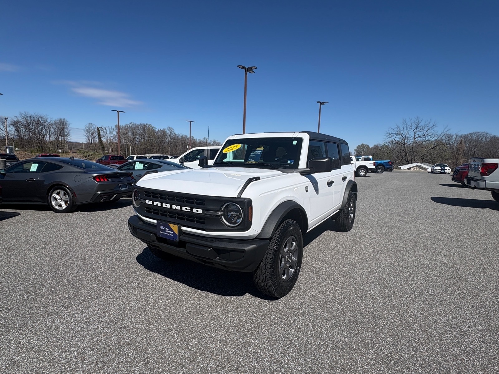 Oxford White 2025 Ford Bronco Big Bend 4WD 10-Speed Automatic 2.3L EcoBoost I-4Equipment Group 222A Mid Package (2-Door Intelligent Access w/Lock/Unlock, Ambient Footwell Lighting, Connected Navigation, Dr & Pass Illuminated Sliding Visor Vanity Mirrors, Dual Smart Charging USB Ports, Dual-Zone Electronic Automatic Temperature Control, Front Row Heated Seats, Power Outlet - Back Side of Center Floor Console, and Rear Parking Sensors), 4-Wheel Disc Brakes, 4.46 Axle Ratio, 7 Speakers, ABS brakes, Air Conditioning, Alloy wheels, AM/FM radio: SiriusXM with 360L, AM/FM Stereo, Auto High-Beam Headlamps, Auto High-beam Headlights, BLIS Blind Spot Information System, Brake assist, Carbonized Gray Molded-In-Color Hard Top, Cloth Bucket Seats, Compass, Delay-off headlights, Driver door bin, Driver vanity mirror, Dual front impact airbags, Dual front side impact airbags, Electronic Stability Control, Emergency communication system: 911 Assist, Exterior Parking Camera Rear, Front anti-roll bar, Front Bucket Seats, Front Center Armrest, Front License Plate Bracket, Front reading lights, Front wheel independent suspension, Fully automatic headlights, Heated door mirrors, Illuminated entry, Integrated roll-over protection, Internet access capable: FordPass Connect, Lane-Keeping System, Leather Shift Knob, Low tire pressure warning, Occupant sensing airbag, Outside temperature display, Overhead airbag, Overhead console, Panic alarm, Passenger door bin, Passenger vanity mirror, Power door mirrors, Power steering, Power windows, Pre-Collision Assist w/Automatic Emergency Braking, Radio data system, Rear-View Camera, Rear-Window Defroster & Washer, Remote keyless entry, Security system, SiriusXM w/360L, Speed control, Split folding rear seat, Steering wheel mounted audio controls, SYNC 4, Tachometer, Telescoping steering wheel, Tilt steering wheel, Traction control, Trip computer, Variably intermittent wipers, and Wheels: 17 Carbonized Gray-Painted Aluminum.