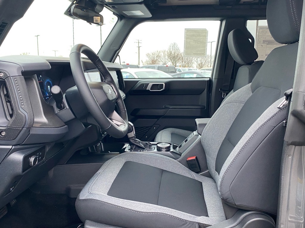 Gray 2025 Ford Bronco Big Bend 4WD 10-Speed Automatic 2.3L EcoBoost I-4 Black Appearance Package (Black Molded-In-Color Door Handles, Black Molded-In-Color Fender Flares, Black Molded-In-Color Sideview Mirror Caps, and Black-Painted Molded-In-Color Grille), Equipment Group 222A Mid Package (2-Door Intelligent Access w/Lock/Unlock, Ambient Footwell Lighting, Connected Navigation, Dr & Pass Illuminated Sliding Visor Vanity Mirrors, Dual Smart Charging USB Ports, Dual-Zone Electronic Automatic Temperature Control, Front Row Heated Seats, Power Outlet - Back Side of Center Floor Console, and Rear Parking Sensors), 4-Wheel Disc Brakes, 4.46 Axle Ratio, 7 Speakers, ABS brakes, Air Conditioning, Alloy wheels, AM/FM radio: SiriusXM with 360L, AM/FM Stereo, Auto High-Beam Headlamps, Auto High-beam Headlights, BLIS Blind Spot Information System, Brake assist, Cloth Bucket Seats, Compass, Delay-off headlights, Driver door bin, Driver vanity mirror, Dual front impact airbags, Dual front side impact airbags, Electronic Stability Control, Emergency communication system: 911 Assist, Exterior Parking Camera Rear, Front anti-roll bar, Front Bucket Seats, Front Center Armrest, Front License Plate Bracket, Front reading lights, Front wheel independent suspension, Fully automatic headlights, Hard Top Sound Deadening Headliner, Heated door mirrors, Illuminated entry, Integrated roll-over protection, Internet access capable: FordPass Connect, Lane-Keeping System, Leather Shift Knob, Low tire pressure warning, Occupant sensing airbag, Outside temperature display, Overhead airbag, Overhead console, Panic alarm, Passenger door bin, Passenger vanity mirror, Power door mirrors, Power steering, Power windows, Pre-Collision Assist w/Automatic Emergency Braking, Radio data system, Rear-View Camera, Rear-Window Defroster & Washer, Remote keyless entry, Security system, Shadow Black Painted Hard Top, SiriusXM w/360L, Speed control, Split folding rear seat, Steering wheel mounted audio controls, SYNC 4, Tachometer, Telescoping steering wheel, Tilt steering wheel, Traction control, Trip computer, Variably intermittent wipers, and Wheels: 17Carbonized Gray-Painted Aluminum. Price includes: $1000 - Presidents Day Retail Bonus Cash. Exp. 02/16/2026 $2500 - Retail Customer Cash. Exp. 03/31/2026 $2500 - Retail Customer Cash. Exp. 03/31/2026