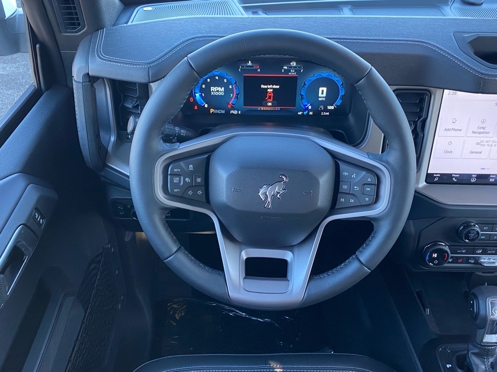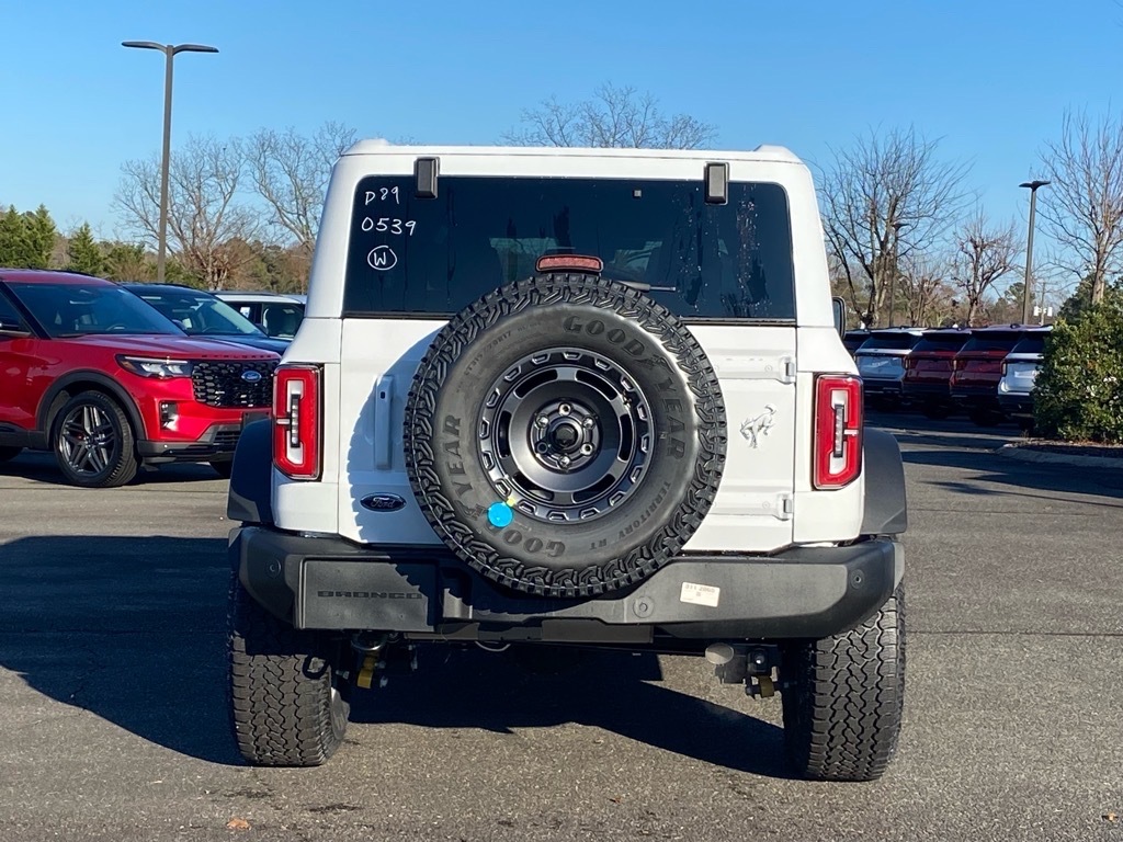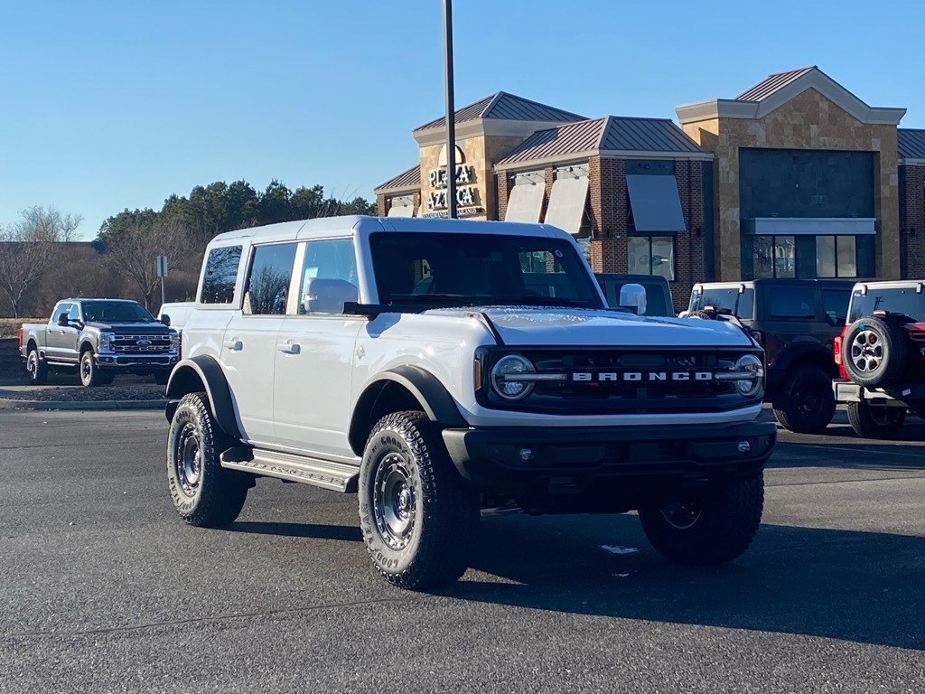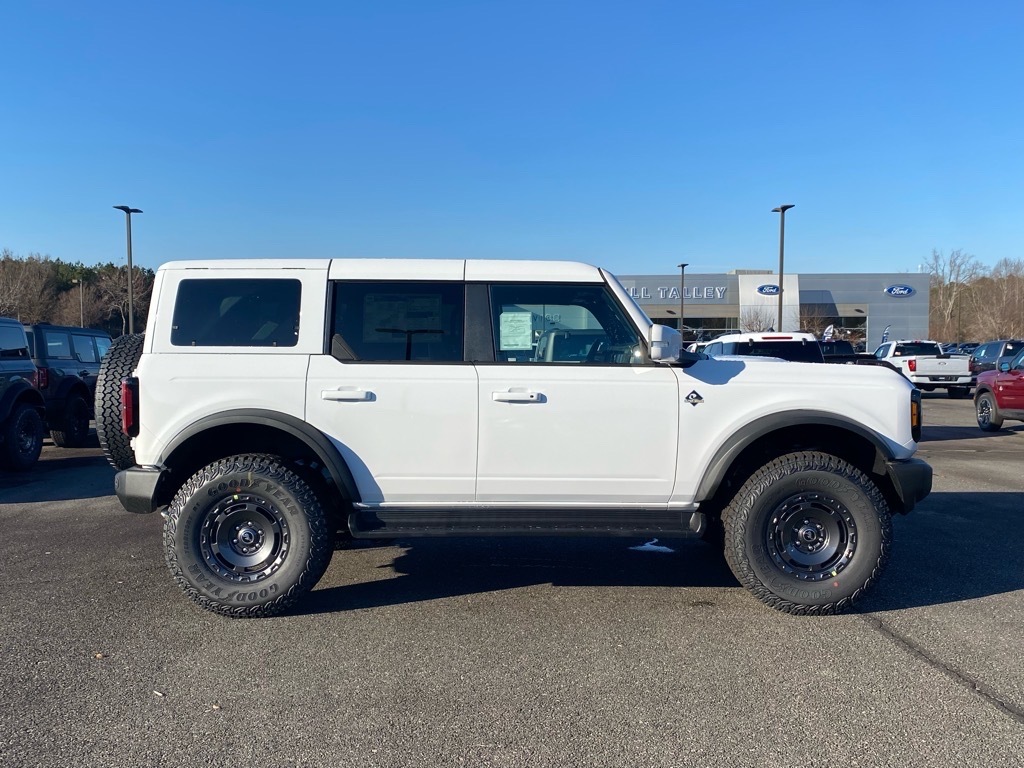 Oxford White 2025 Ford Bronco Outer Banks 4WD 10-Speed Automatic 2.7L EcoBoost V6 Equipment Group 314A Lux Package (360-Degree Camera, Adaptive Cruise Control, Evasive Steering Assist, Front Parking Sensors, Information on Demand Panel, Radio: B&O Sound System by Bang & Olufsen, Sideview Mirrors, and Universal Garage Door Opener), Sasquatch Package (High Clearance Fender Flares, High Clearance Suspension, Position-Sensitive Bilstein Shock Absorbers, and Wheels: 17Carbonized Gray Painted Aluminum), 18Bright Machined Aluminum Wheels, 4-Wheel Disc Brakes, 7 Speakers, ABS brakes, Air Conditioning, Alloy wheels, AM/FM radio: SiriusXM with 360L, AM/FM Stereo, Auto High-beam Headlights, Auto-dimming Rear-View mirror, Automatic temperature control, Brake assist, Compass, Connected Navigation, Delay-off headlights, Driver door bin, Driver vanity mirror, Dual front impact airbags, Dual front side impact airbags, Electronic Stability Control, Emergency communication system: 911 Assist, Exterior Parking Camera Rear, Front anti-roll bar, Front Bucket Seats, Front Center Armrest, Front dual zone A/C, Front fog lights, Front License Plate Bracket, Front reading lights, Front wheel independent suspension, Fully automatic headlights, Hard Top Sound Deadening Headliner, Heated door mirrors, Heated front seats, Heated Leather-Trimmed/Vinyl Bucket Seats, Heated steering wheel, Illuminated entry, Integrated roll-over protection, Leather Shift Knob, Low tire pressure warning, Navigation system: Connected Navigation, Occupant sensing airbag, Outside temperature display, Overhead airbag, Overhead console, Painted Hard Top, Panic alarm, Passenger door bin, Passenger vanity mirror, Power door mirrors, Power driver seat, Power passenger seat, Power steering, Power windows, Radio data system, Rear seat center armrest, Rear-Window Defroster & Washer, Remote keyless entry, Security system, SiriusXM w/360L, Speed control, Split folding rear seat, Steering wheel mounted audio controls, SYNC 4, Tachometer, Telescoping steering wheel, Tilt steering wheel, Traction control, Trip computer, Variably intermittent wipers, and Voltmeter. Price includes: $2750 - Retail Customer Cash. Exp. 04/30/2026