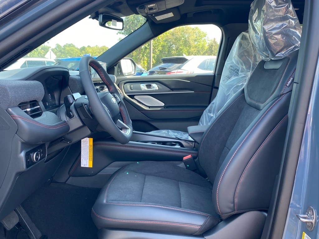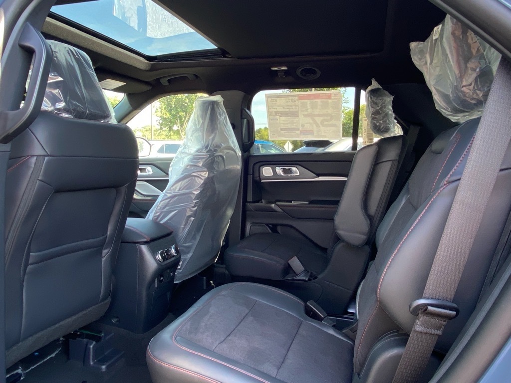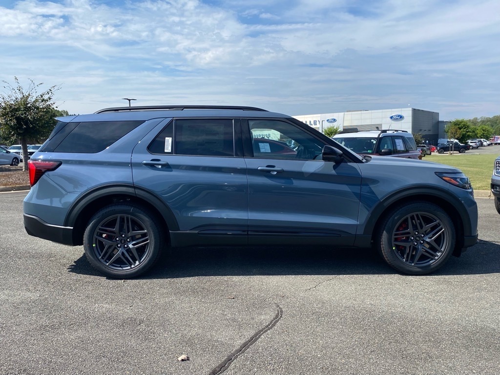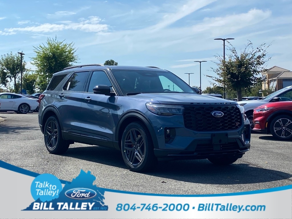 New Price! Blue 2025 Ford Explorer ST 4WD 10-Speed Automatic 3.0L EcoBoost V6 4WD. Equipment Group 400A Standard Package, Sun and Sound Package (B&O Sound System by Bang & Olufsen, Multicontour Seats w/Front Active Motion, and Panoramic Vista Roof w/Power Shade), 4WD, 10 Speakers, 3.58 Non-Limited Slip Rear Axle, 3rd row seats: bench, 4-Wheel Disc Brakes, ABS brakes, Air Conditioning, Alloy wheels, AM/FM radio: SiriusXM with 360L, Apple CarPlay/Android Auto, Auto High-beam Headlights, Auto-dimming door mirrors, Auto-dimming Rear-View mirror, Automatic temperature control, Brake assist, Bumpers: body-color, Compass, Delay-off headlights, Driver door bin, Driver vanity mirror, Dual front impact airbags, Dual front side impact airbags, Electronic Stability Control, Emergency communication system: 911 Assist, Exterior Parking Camera Rear, Four wheel independent suspension, Front & 2nd Rows Floor Liners w/Carpet Floor Mats, Front anti-roll bar, Front Bucket Seats, Front Center Armrest, Front dual zone A/C, Front fog lights, Front License Plate Bracket, Front reading lights, Fully automatic headlights, Garage door transmitter, Heated door mirrors, Heated front seats, Heated rear seats, Heated steering wheel, Heated/Ventilated Miko Sport Captains Chairs, Illuminated entry, Knee airbag, Leather steering wheel, Low tire pressure warning, Memory seat, Navigation System, Occupant sensing airbag, Outside temperature display, Overhead airbag, Overhead console, Panic alarm, Passenger door bin, Passenger vanity mirror, Power door mirrors, Power driver seat, Power Liftgate, Power passenger seat, Power steering, Power windows, Radio: B&O Sound System by Bang & Olufsen, Rain sensing wipers, Rear air conditioning, Rear anti-roll bar, Rear reading lights, Rear window defroster, Rear window wiper, Remote keyless entry, SecuriCode Keyless Entry Keypad, Security system, Speed control, Speed-sensing steering, Speed-Sensitive Wipers, Split folding rear seat, Spoiler, Sport steering wheel, S
