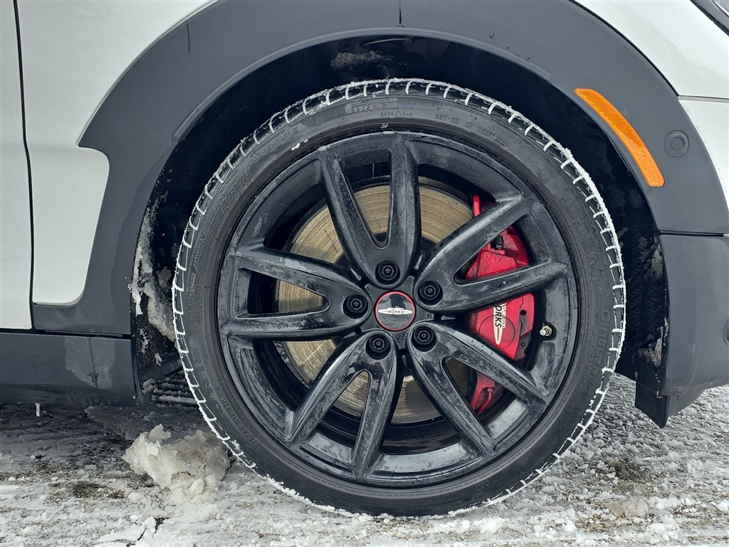 Dual front knee airbags, four-wheel disc brakes with anti-lock, electronic brake force distribution, standby brakes, cornering brake control, automatic self-drying brakes, hill assist, dynamic traction control with electronic differential lock control, dynamic stability control, side-impact door beams, central locking system, engine immobilizer, comfort keyless entry, daytime driving lights, automatic headlights, Bluetooth hands free phone system, and tire pressure monitoring system. Cooper S adds run-flat tires.