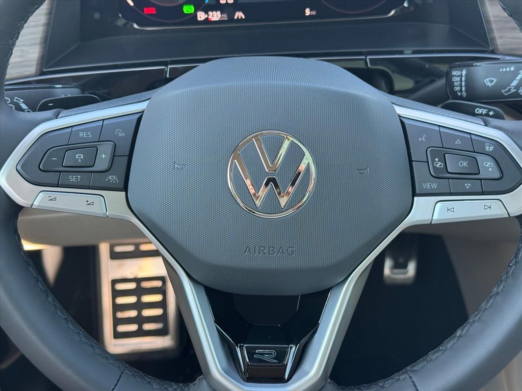 a heated leather-wrapped R-Line steering wheel with paddle shifters